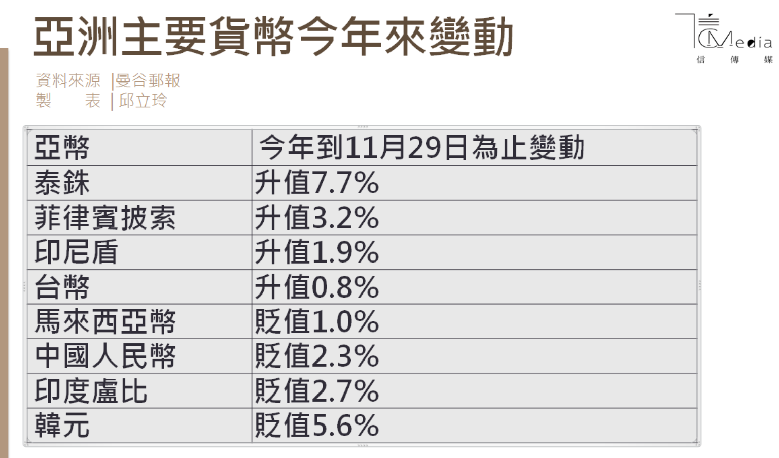 12月3日,泰銖兌美元匯價來到1美元兌30.27泰銖,逼近2013年6月以來的6年多最高水準,1泰銖兌1.0275元台幣。