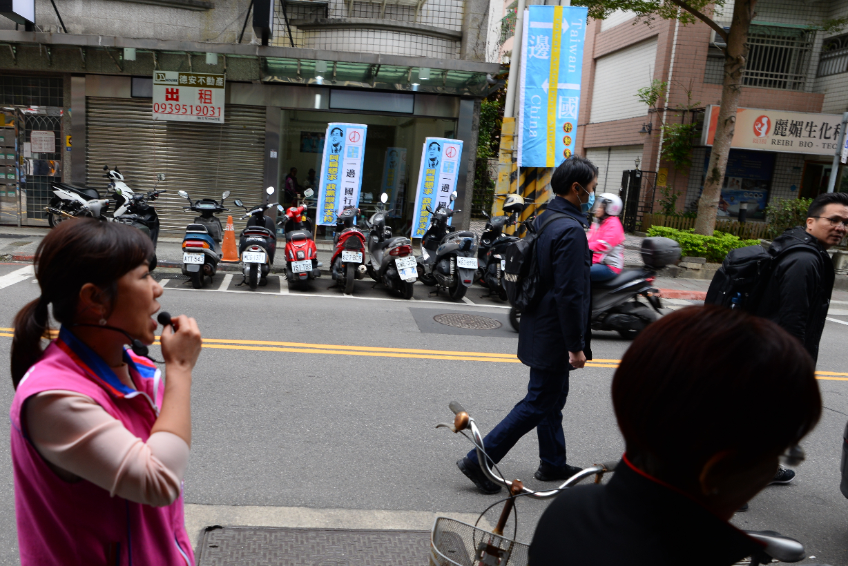 而在掃街同時,李彥秀與洪秀柱一行人經過一邊一國黨的競選辦公室,隨行工作人員示意大家避開。(攝影/趙世勳)