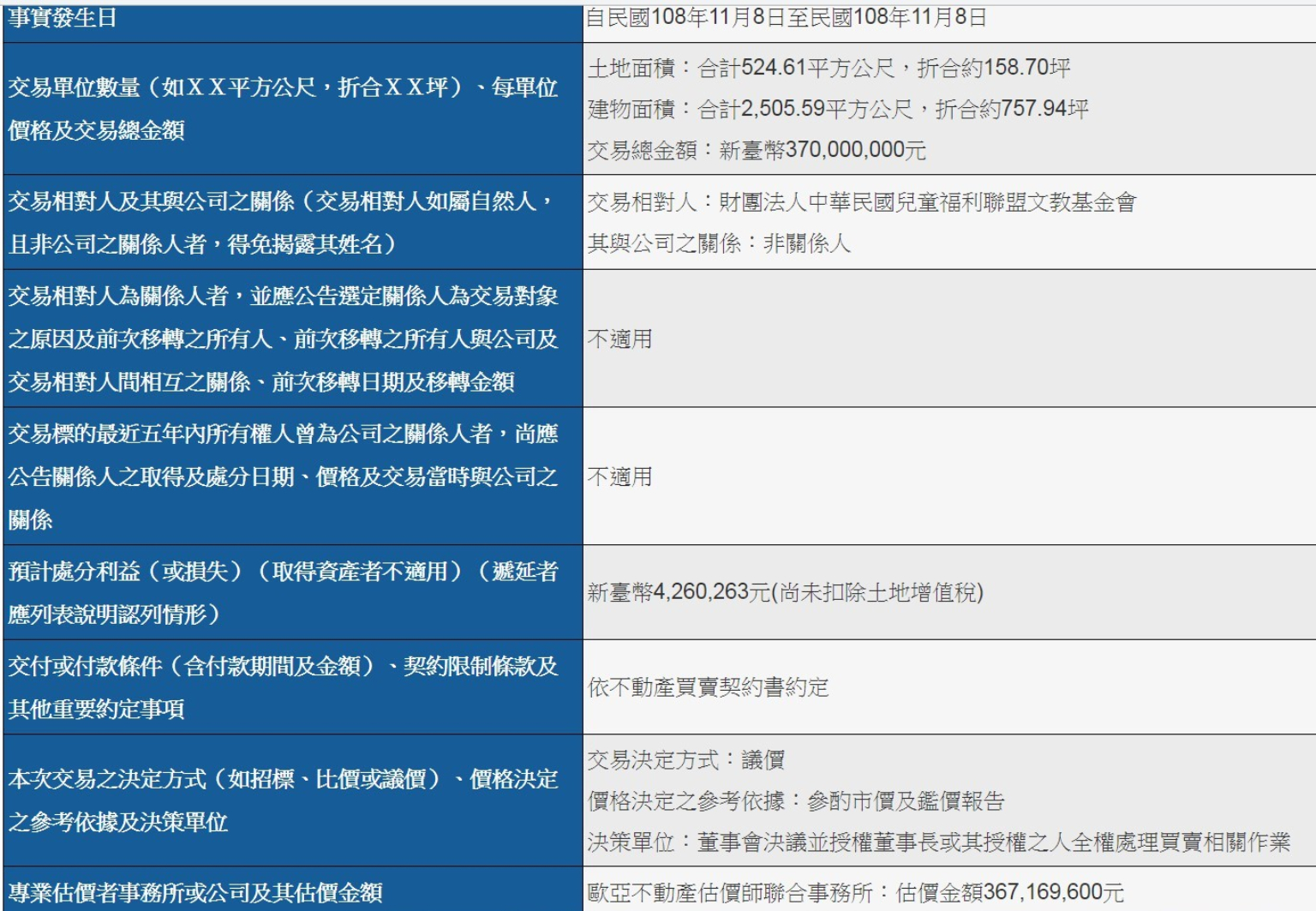 根據公開資訊觀測站,兒福於今年11月8日簽下內湖瑞光路一層辦公室,尚未交屋,權狀面積合計757.92坪,分別是房屋部分614.4坪(室內面積451.94坪)和14個停車位。