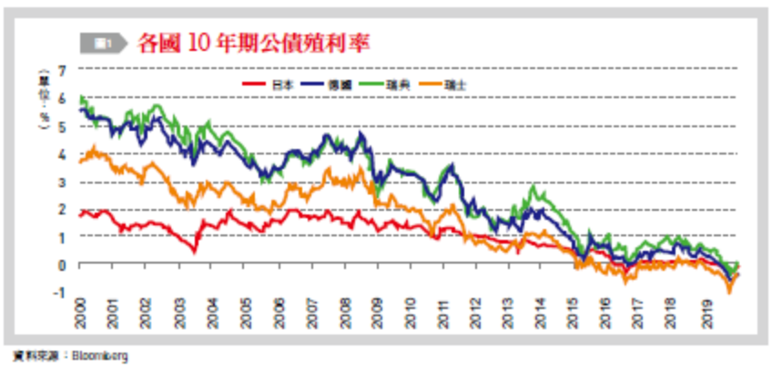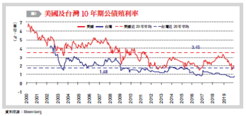 俗話說:「砍頭生意有人做,賠錢生意沒人做。」但奇怪的是,即使全球主要央行紛紛調降政策目標利率,公債殖利率也相應走低,日本、德國、瑞典及瑞士的10年期公債殖利率甚至落入負值〔圖1〕;美國及台灣雖然保持在正值,但過去20年的美國、台灣10年期公債殖利率平均為3.45%、1.68%,目前卻僅有1.92%、0.70%〔圖2〕,投資人卻仍趨之若鶩。這代表市場認為全球經濟前景充滿不確定性,遂寧願將資金置於相對安全的政府公債。