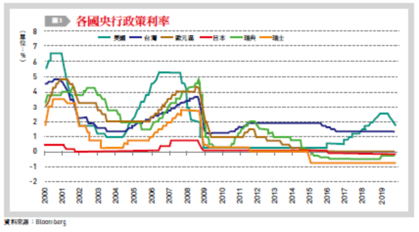 問題是,除了日本、瑞典與瑞士外,目前主要國家政策利率雖仍維持在0%以上,但已大多低於2%。其中,歐洲央行再融資利率長期位於0%,而央行隔夜存款利率早在2014年6月已降為負值,2019年9月第五度調降10個基點至-0.5%;美國聯準會則以通膨不及目標與避免經濟衰退為由,進行「預防性」降息,自7月31日起已三度降息,至10月底聯邦資金利率已下調到1.5%~1.75%。此外,10月澳洲及韓國亦緊跟著陸續降息。至於新興國家方面,中國人民銀行於9月宣布調降存款準備率2碼、11月下調中期借貸便利(MLF)利率至3.25%,部分新興市場國家也接連宣布降息〔圖3〕。也由於官方的政策利率被視為其他市場利率的參考基準(benchmark),以至於在各國央行相繼降息的情況下,全球利率維持低檔便是再自然不過的事。