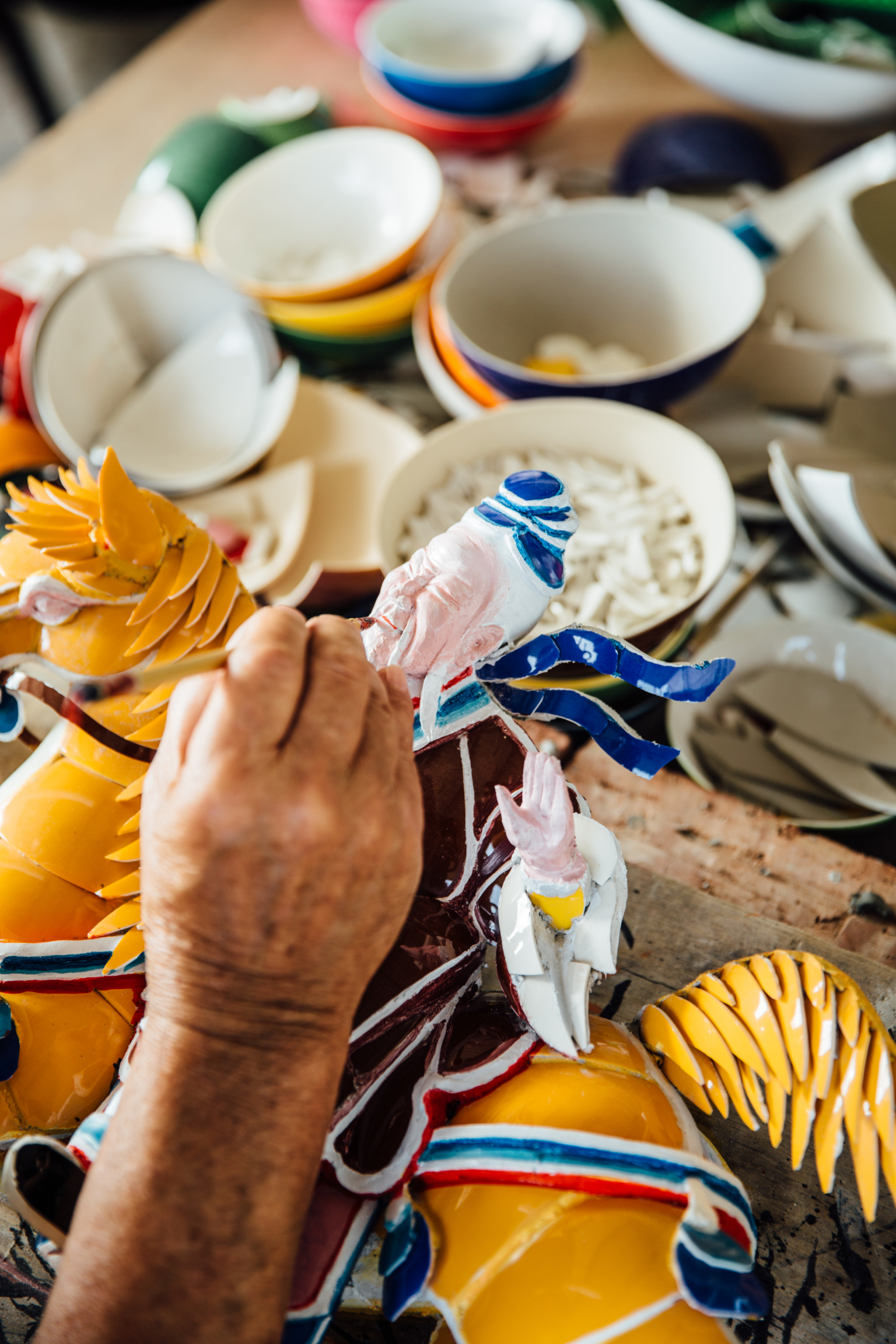 「活到老,學到老。」徐明河笑著說,除了熱情是不夠的,因此他從學徒開始就什麼都學,不論是剪黏或交趾陶,即便到現在,只要有機會經過不同廟宇,他也會仔細觀察屋頂與牆面的作品是使用什麼材質跟工法來製作。