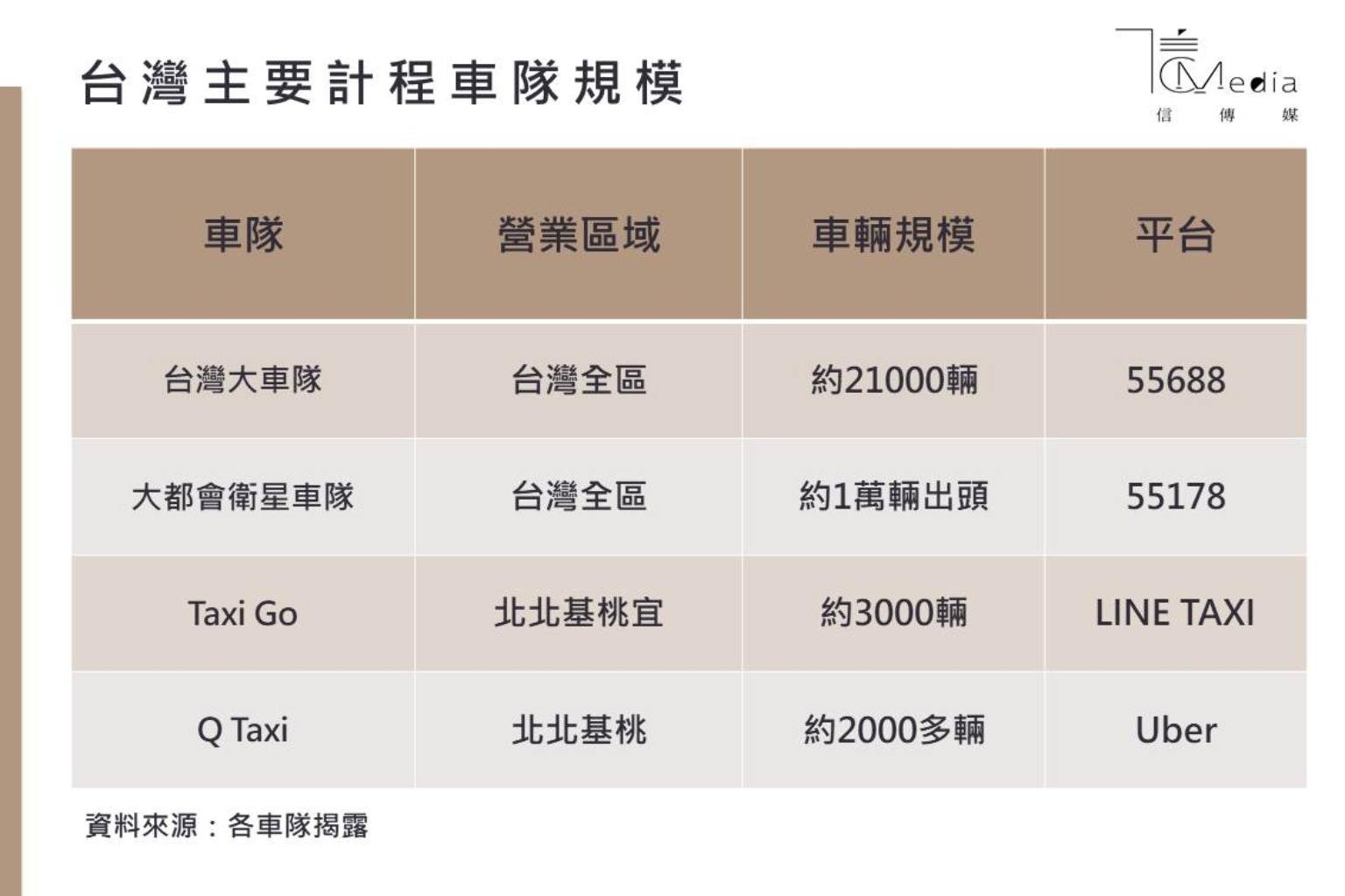 觀察目前台灣主要的計程車規模,仍以台灣大車隊全台車輛2萬1000輛,穩居「老大哥」地位;大都會衛星車隊則以全省1萬輛出頭的規模,居於第二位;另外與LINE合作的TaxiGo目前在北北基桃地區則約有3千輛車;至於與Uber合作的Q Taxi,輔導代僱駕駛轉換為多元化計程車,目前車輛規模約有2千多輛。