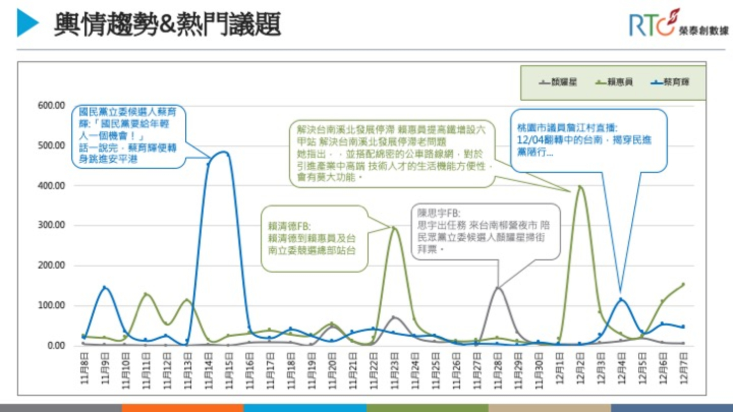 依總聲量來看,賴惠員占46%、蔡育輝44%、顏耀星只有10%。領先的賴惠員除了有前行政院長賴清德站台輔選的新聞效益,她拋出的高鐵增設六甲站政見,在網路社群引來不少的討論。