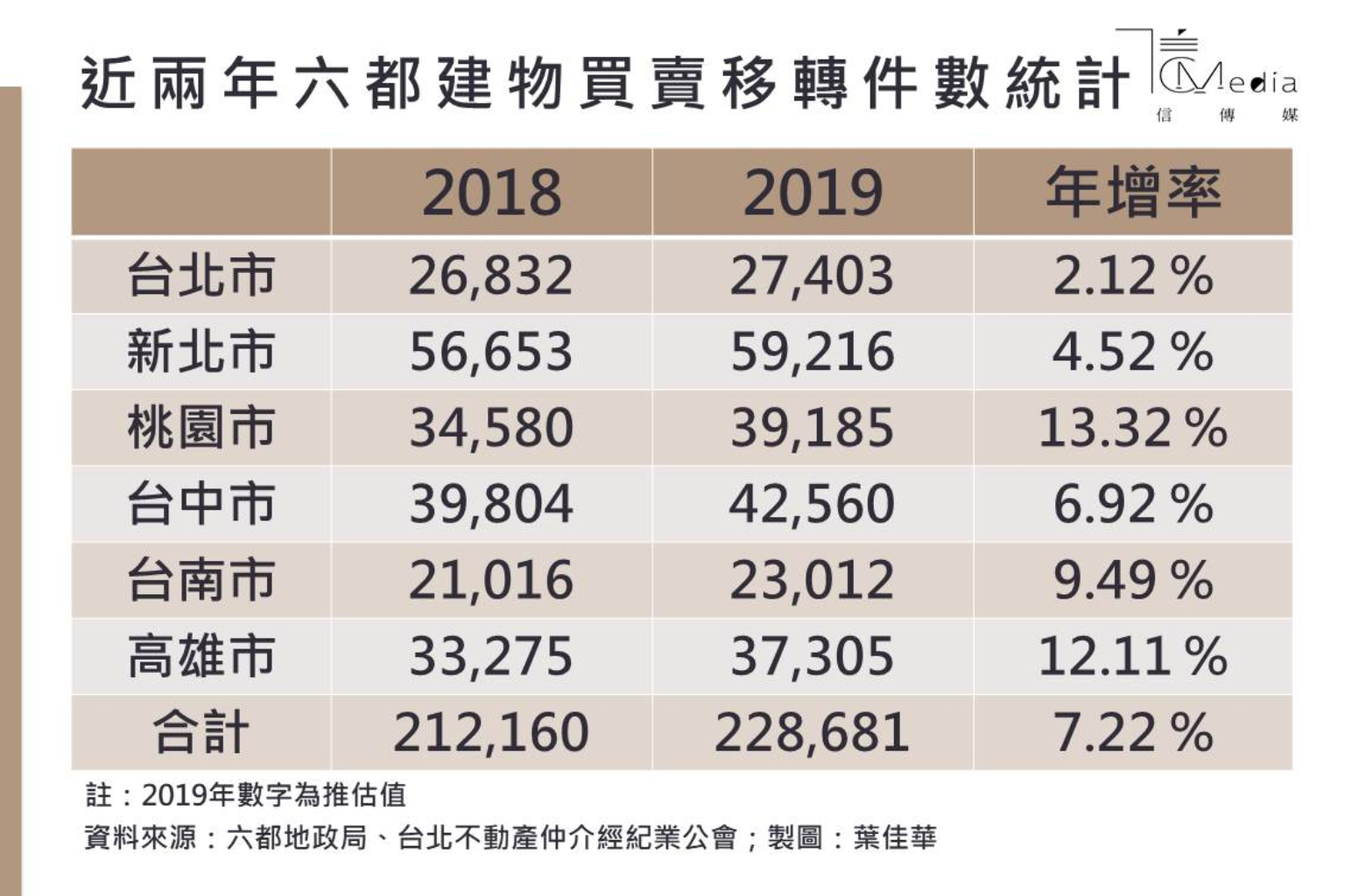 「今年台北市移轉量年增率在六都敬陪末座,主要還是房價偏高的關係。」不過,台北市仲介公會理事長黃文雄表示,雖然今年全球有美中貿易戰等外部因素干擾,但台灣卻意外成為受惠國,包括台商資金回流、香港反送中激起港人購屋需求、股市「萬一」等效應,整體房市依舊比去年好,六都交易量都是呈現「正成長」。