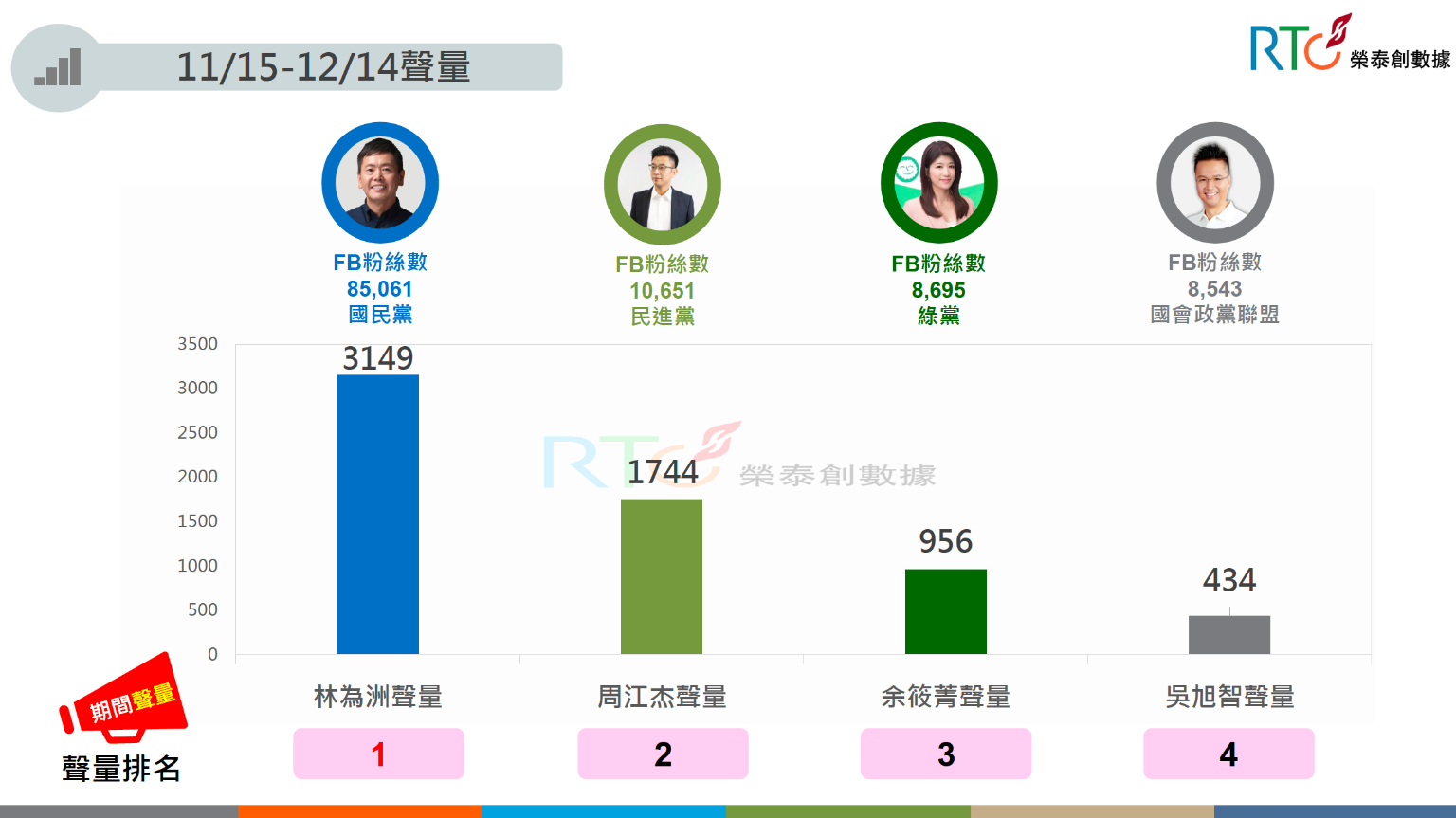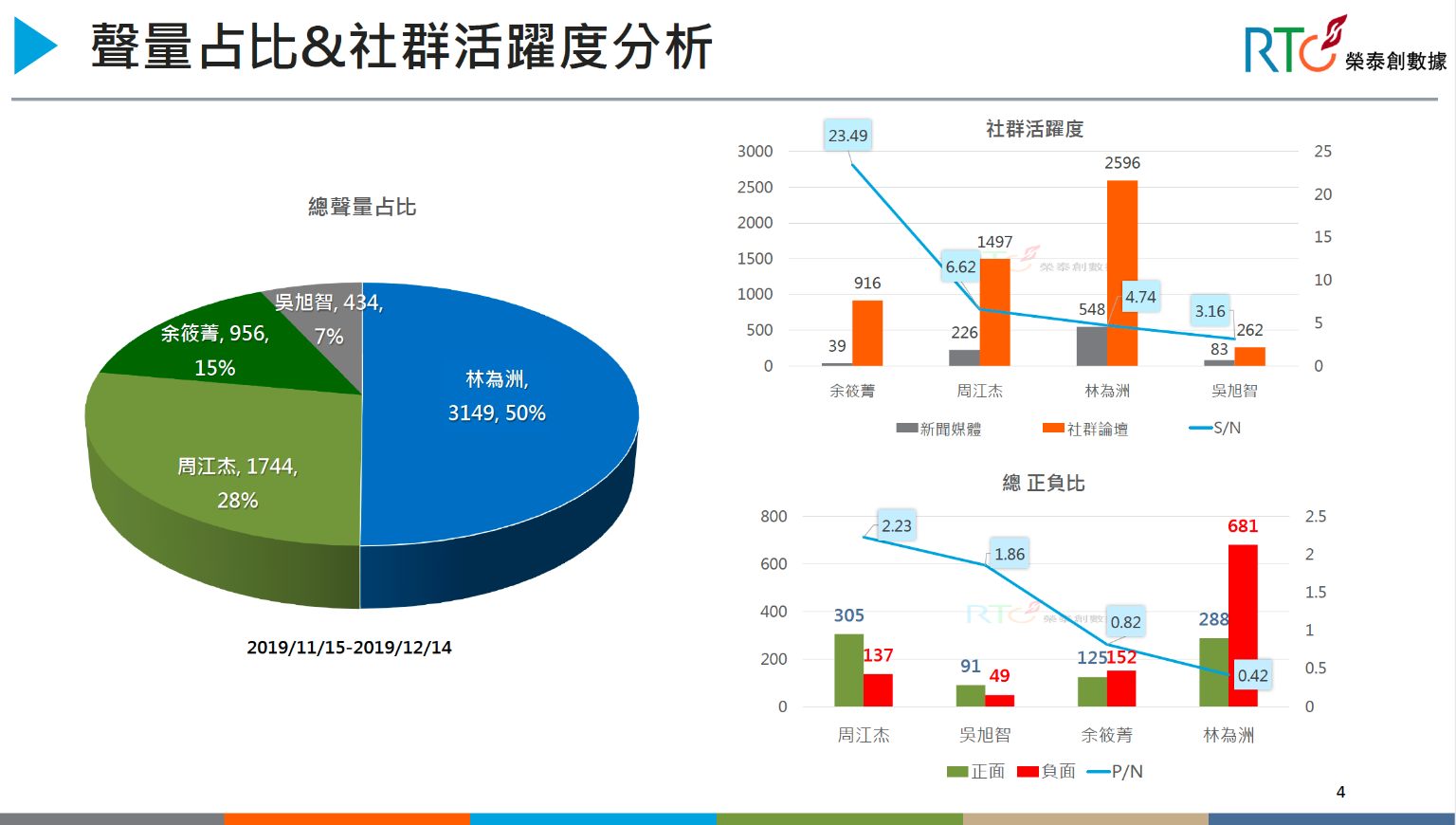 根據《榮泰創數據》的分析,在聲量總正負評中,周江杰脫穎而出高居第一,吳旭智雖然在其他聲量都是第四名,但正負比位居第二;反觀林為洲雖然聲量、FB粉絲數都是第一名,但正負比卻是最低的,顯示負面聲量偏高。