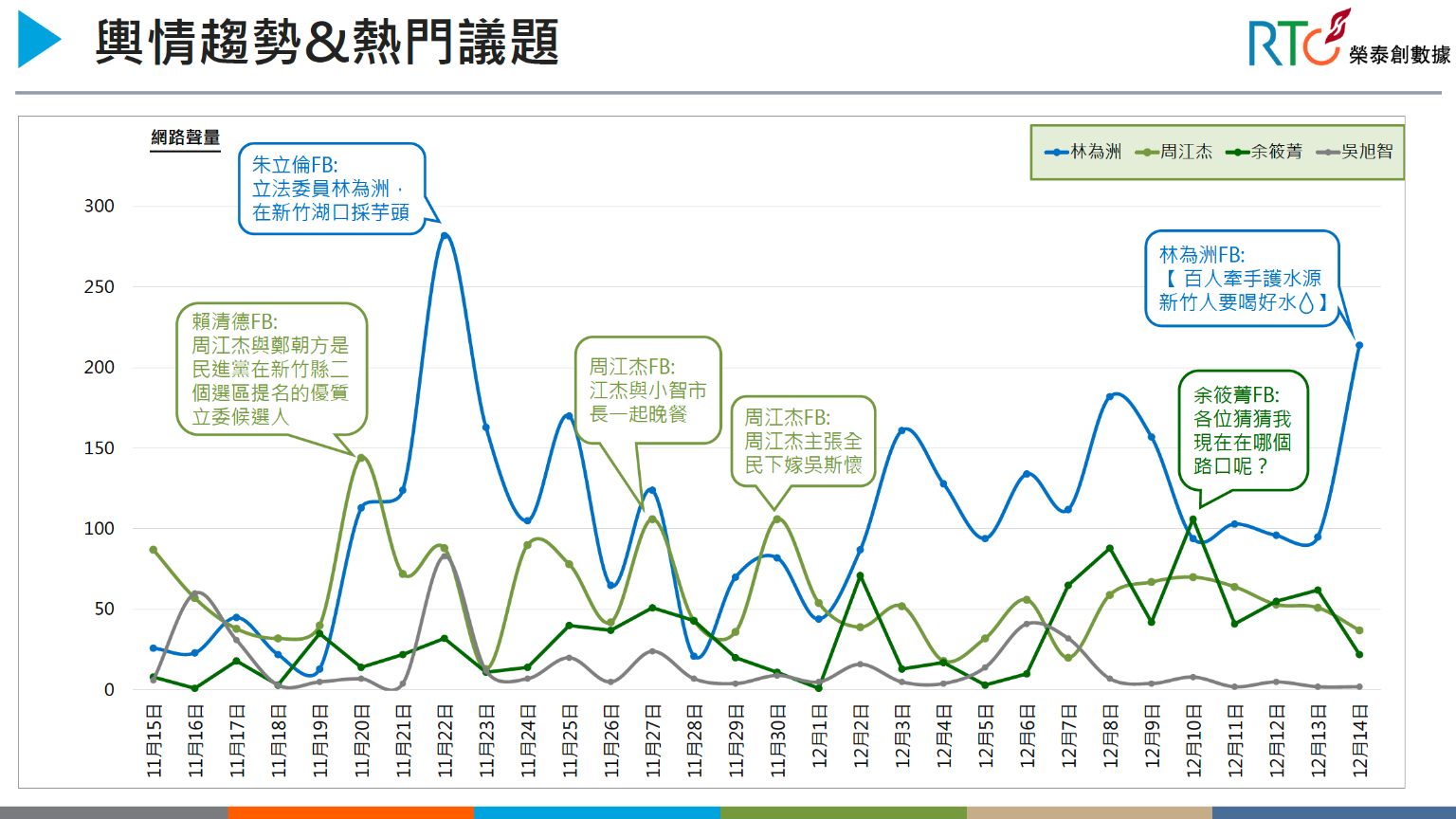 以趨勢圖來觀察,林為洲最高峰出現在前新北市長朱立倫11月下旬的發文中,其餘大家幾乎以各自臉書發文聲量為主,也沒有足以造成選情劇烈變化的重要議題。