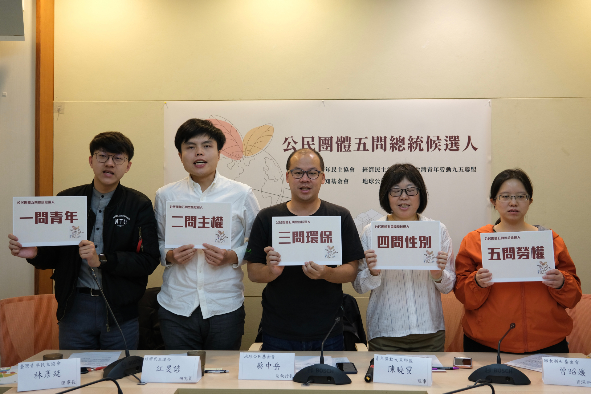 因此,青民協邀請其他公民團體,從青年、主權、環保、性別,及勞權提出5大問題,期望3組正副總統候選人在未來的政見發表會甚至是辯論會都能正面回應提出具體政策。