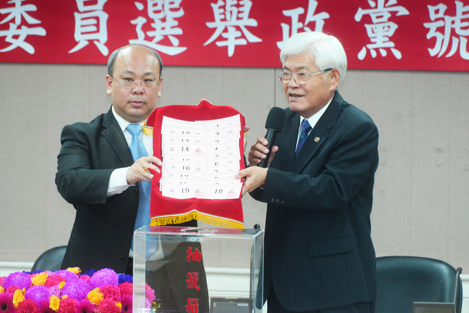 今日中選會主任委員李進勇表示,申請的政黨資格經過中選會委員會議審定,最後由審定合格的19個政黨舉行公開號次抽籤,副主委陳朝建擔任監察人員。