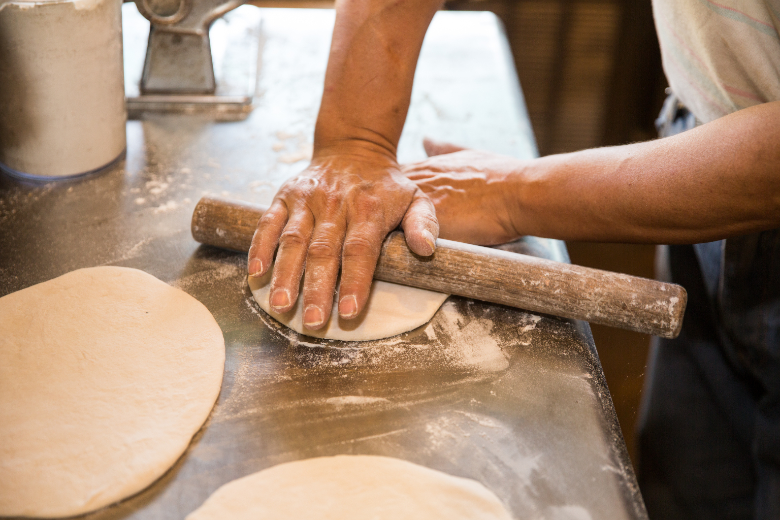 這裡的餅皮沒有過多的添加物,只有使用鹽、糖、老麵,揉著早上才醒的麵團。將麵團桿平後,刷上鮮紅色的自製番茄醬,接著擺滿彩椒及配料,最後再抓一大把起士鋪上,餅皮上滿溢的餡料看起來超豐盛。將披薩送進窯爐後,過沒幾分鐘香氣便飄散整個空間,全憑店家經驗與香氣決定出爐時間。才剛上桌,拿起一片大口咬下,口感酥脆且不刮口,同時保留麵團清香與木柴質調,而披薩外緣不規則捲起的波浪,更是金黃爽脆,這正是窯燒披薩最有魅力之處!