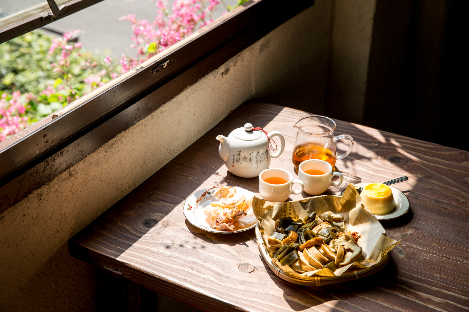 來到龍潭,這個舊時茶葉運送古道的終點、水路運輸的起點,當然要輕啜一口茶香,遙想當年的繁華。前往「石坪茶屋」,老闆呂紹雄承接了父親原本做雜貨店的老屋,店內陳列許多龍潭地區與石門水庫的舊資料,構築成只有此地才有的人文風景,二樓外的窗台爬滿盛開的珊瑚藤,與紅磚老屋相互輝映。