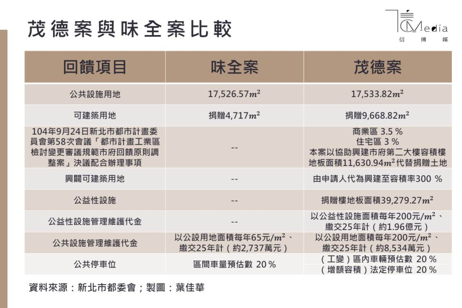 而相較於過去的頂新味全案,此次的茂德案回饋項目也比較多,包括公共設施用地、可建築用地、開闢可建築用地、公益性設施等皆高於味全案。一名新北市城鄉局作業單位承辦人員也直說,「相較之下,這個案子有誠意多了。」