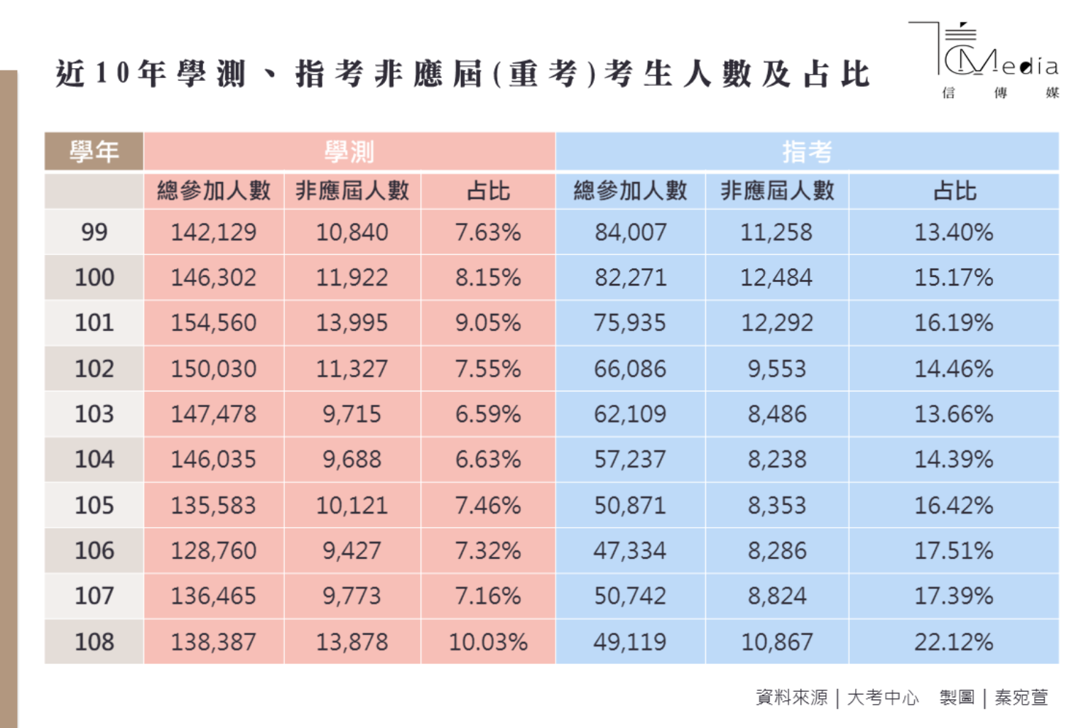 至於在重考生的部分,實際上前幾年重考生的佔比並沒有太大變化,而最明顯的成長就發生在今年,學測非應屆考生從9千成長到1.3萬,佔比10.03%;指考則從8千多人到破萬人報名,佔總參加人數高達2成2。