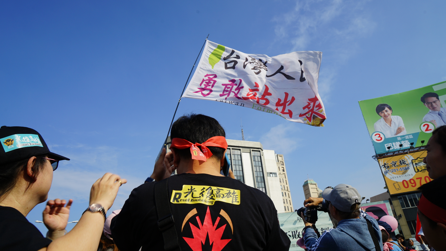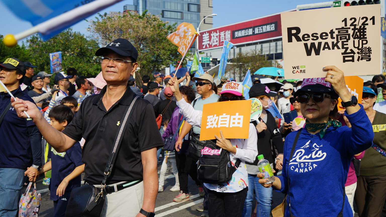 民眾揮著旗幟,身上貼著「光復高雄」,高喊「罷免韓國瑜」、「草包下台」等口號。