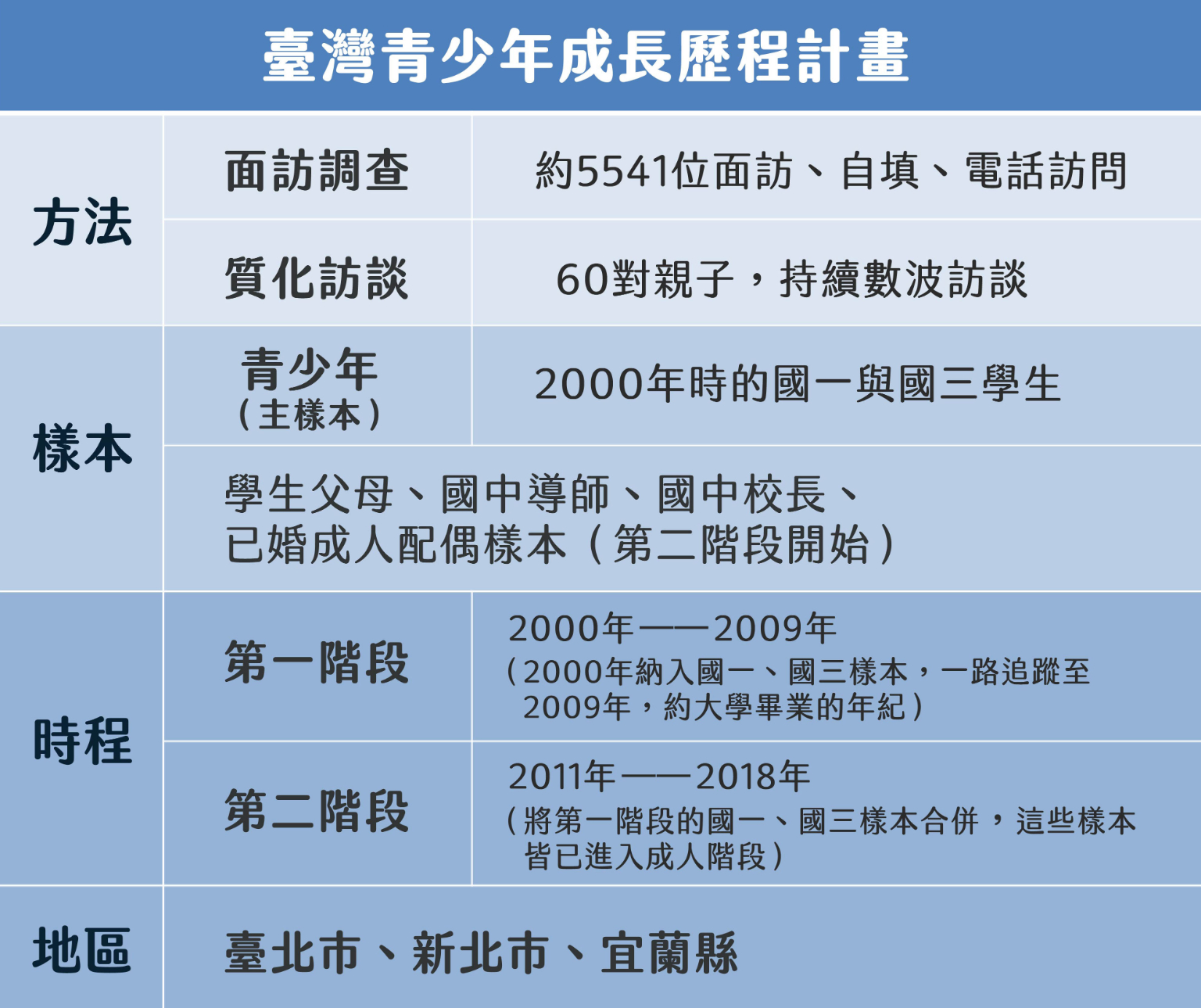 耗時近20年的「臺灣青少年成長歷程計畫」,是難得一見追蹤期如此長的研究。不僅樣本有不同年齡層可相互比較,更有家庭結構、就學歷程、婚姻狀態等數據,提供研究者挖掘各種研究議題。除了前述家庭經驗的分析,計畫中也有關於青少年偏差行為、教育分流與教育成就的分析討論。