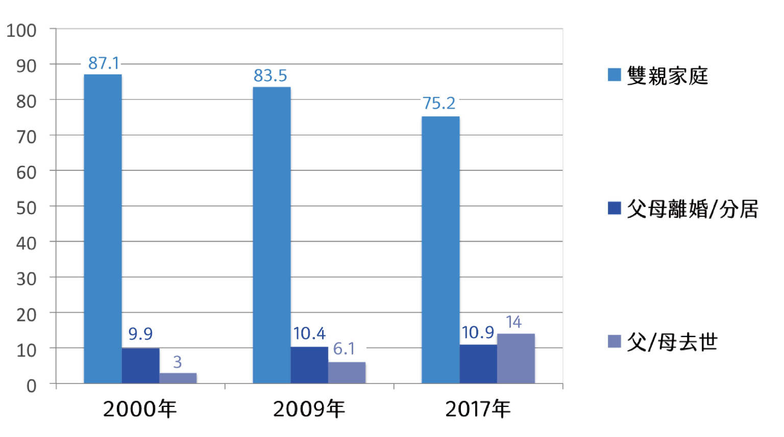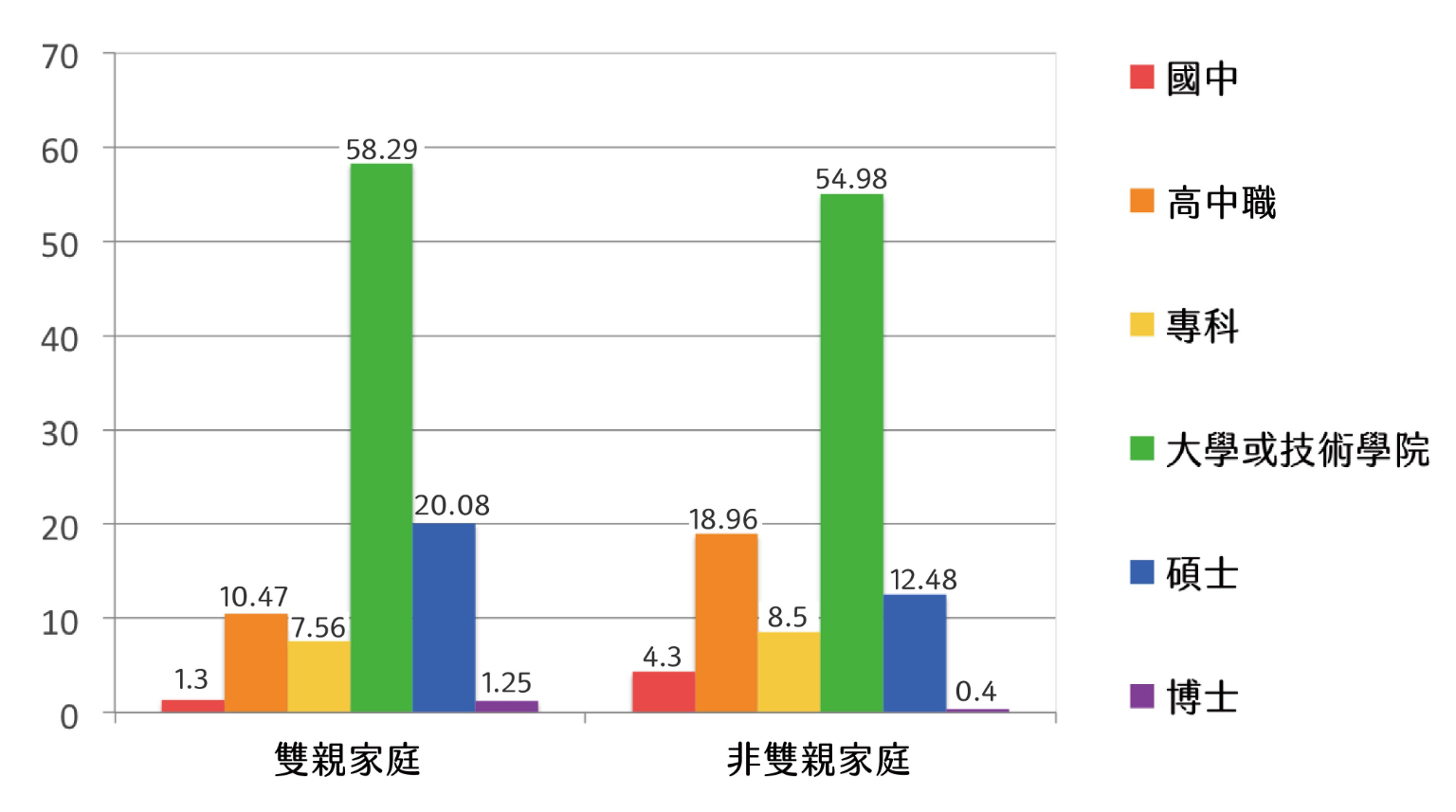 若觀察碩士或高中職的比例就更為清楚了,雙親家庭者相較於非雙親家庭,相差近一成。這說明了「家庭結構」與子女教育成就的關連。