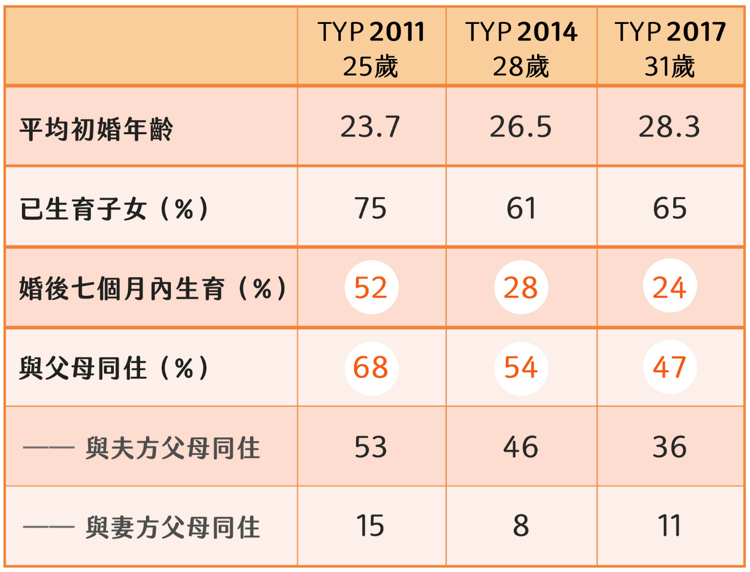 2011年時,這批25歲的樣本有7%進入婚姻生活,平均初婚年齡是23.7歲,屬於早婚者。比較發現,這群早婚者已生育子女及婚後7個月內生育的比例,明顯高於在28歲及31歲才結婚的人。