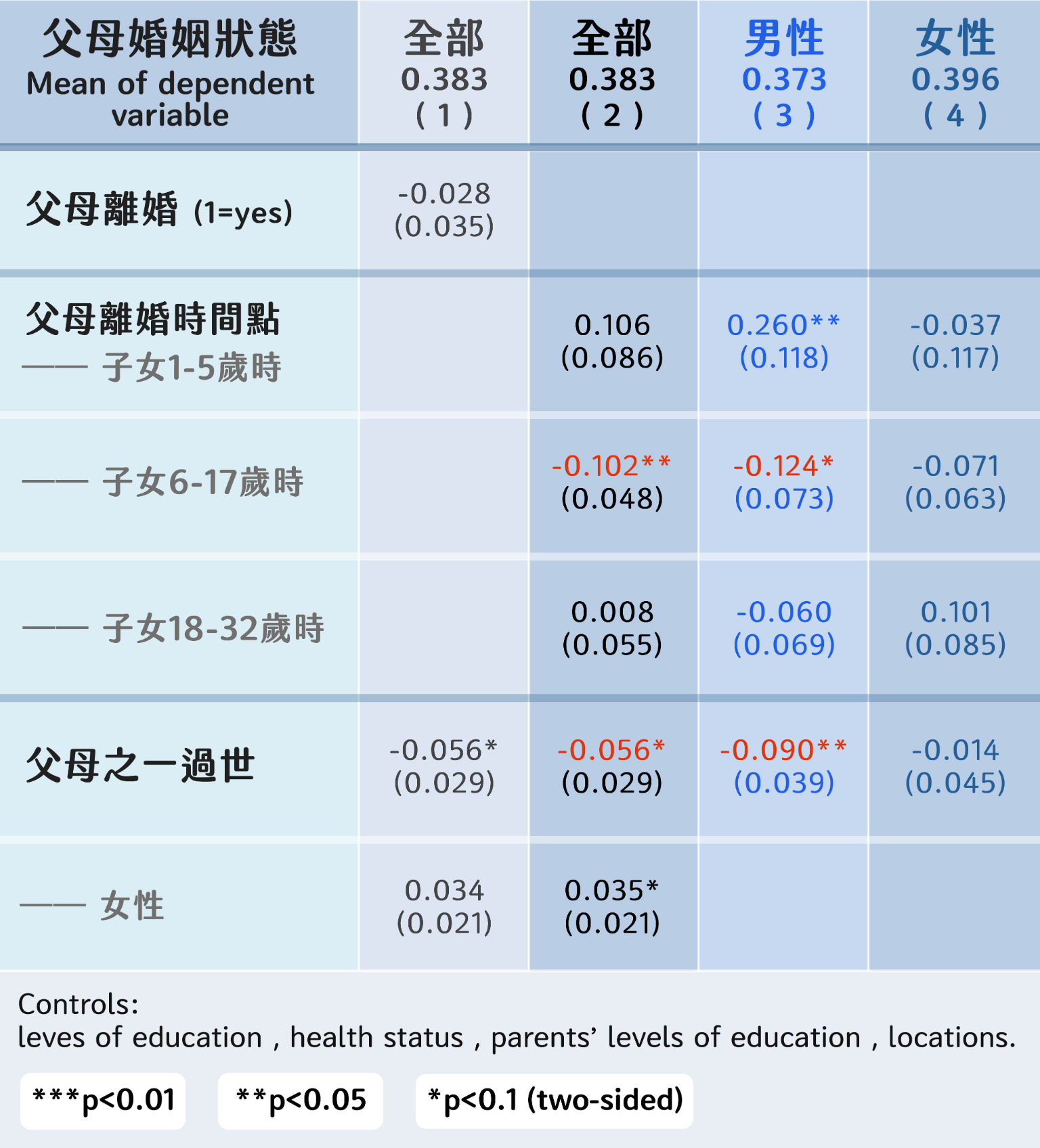 其中,家庭結構改變的另一個原因出現了:父母之一過世的比例約11%。研究中發現,父母過世會明顯降低子女結婚的欲望,顯著度甚至比父母離婚還高。而父母在子女6-17 歲(就學年齡)時離婚,對年輕成人的影響最大,尤其對男性更顯著,明顯降低其結婚的可能性。