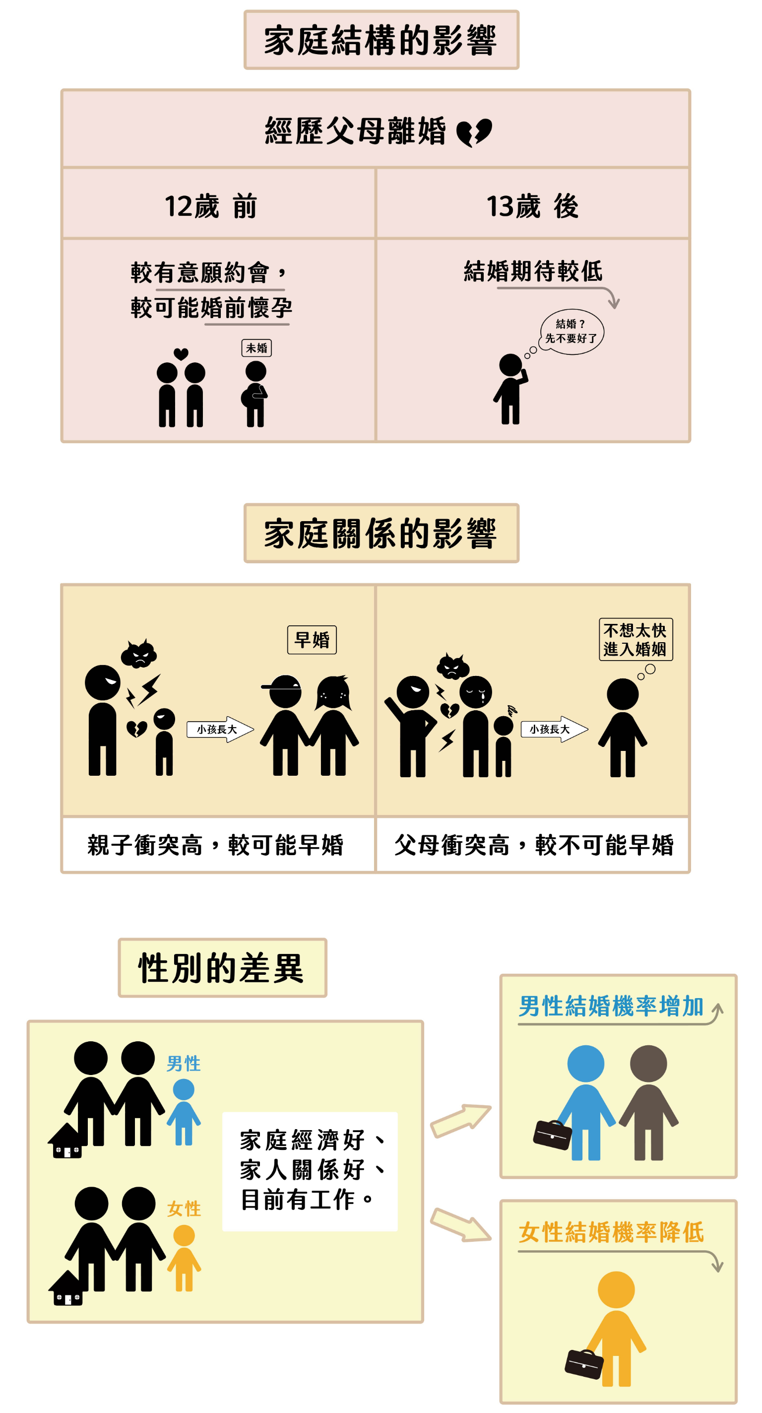 一、以「家庭結構」的面向來看:子女在兒童期經歷父母離婚,成年後較有意願約會、較可能婚前懷孕,但非早婚。如果到青少年期才經歷父母離婚者,則可能使其不想結婚;但對女兒的影響反而可能是早婚且較早生育。