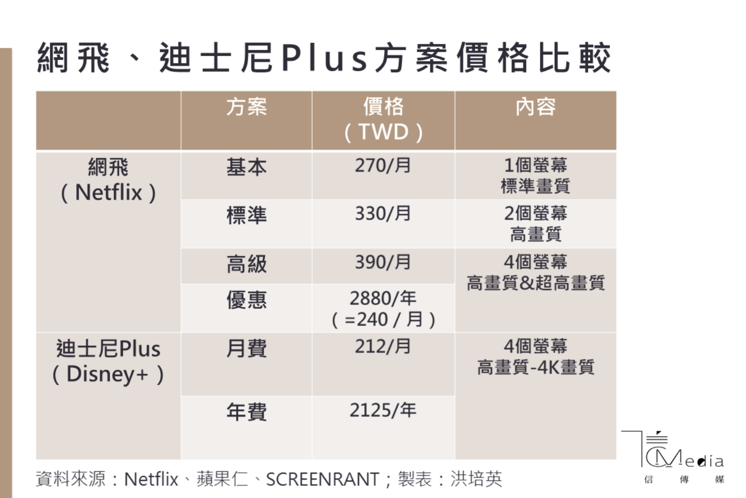 網飛目前提供3種月繳方案,最便宜的「基本方案」可在一個螢幕觀賞標準畫質(SD)影片,每月收費8.99美元;迪士尼Plus只有兩種方案,月繳6.99美元或年繳69.99美元,一個帳號可供4個螢幕使用,影片畫質從HD到4K都有。