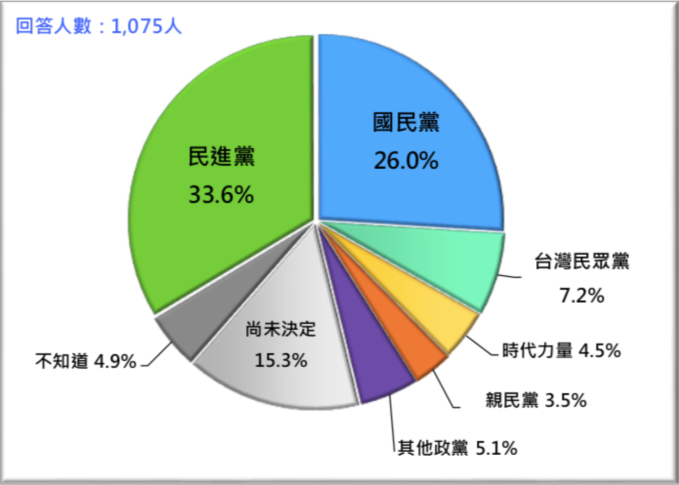 從兩大黨的政黨認同調查看出,偏向民進黨來到47.3%,偏向國民黨的僅有28.9%,兩黨的基本盤差距約為18%,不像總統候選人來得懸殊,但仍是相當可觀的比例。針對政黨票的調查,也是由民進黨33.6%領先,再來是國民黨26%,民眾黨7.2%,時代力量4.5%,親民黨3.5%,其餘政黨5.1%,還有4.9%不知道,15.3%尚未決定。