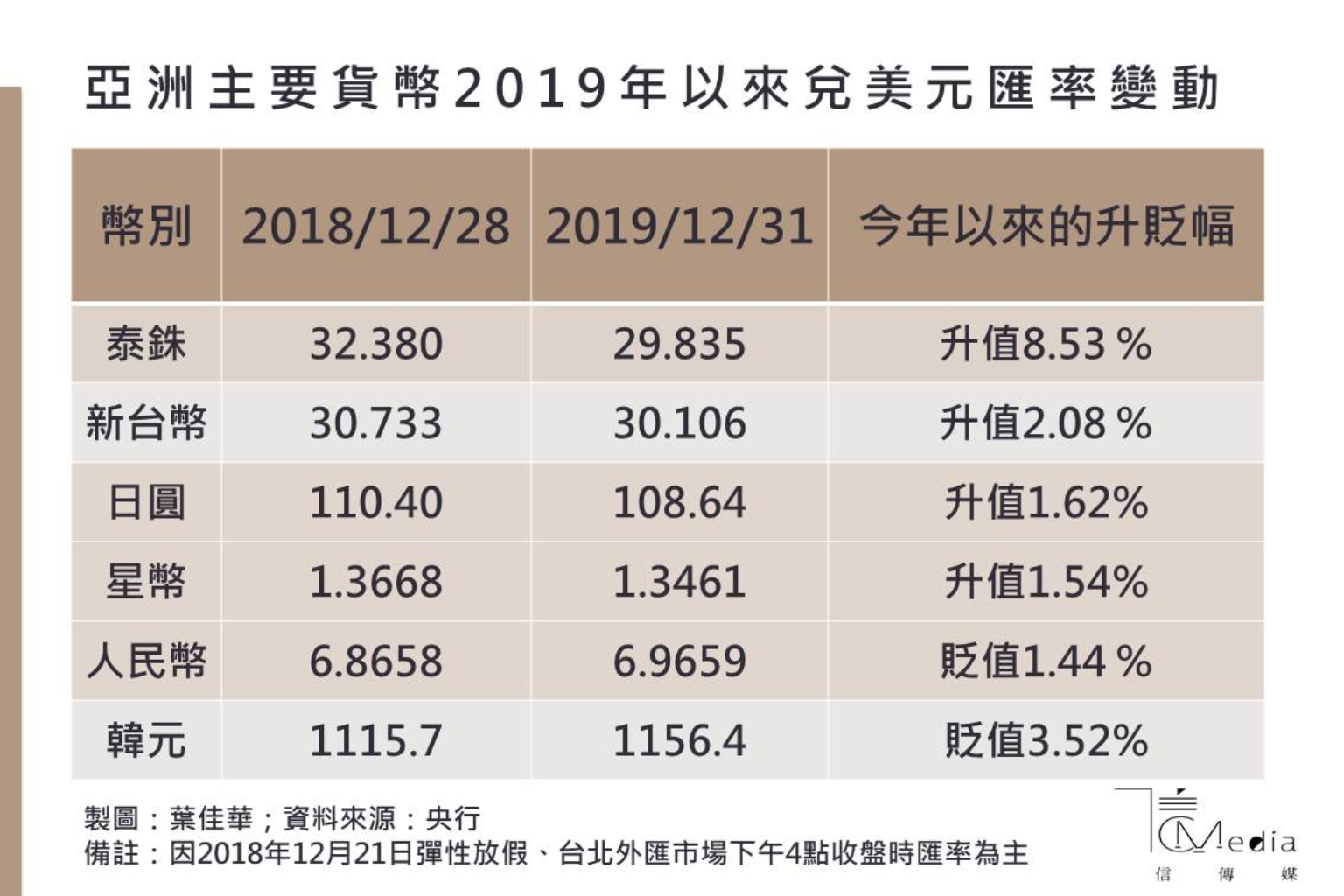 從2019年全年的升貶值幅度來看,泰銖兌美元大升8.53%,居於亞洲主要貨幣之冠,其次是新台幣升值2.08%,居亞幣第二強;日圓則受到2019年第4季避險需求降溫,日圓兌美元回落至108關卡,全年僅小升1.62%;至於星幣則緊追在後,全年升值幅度約1.54%。