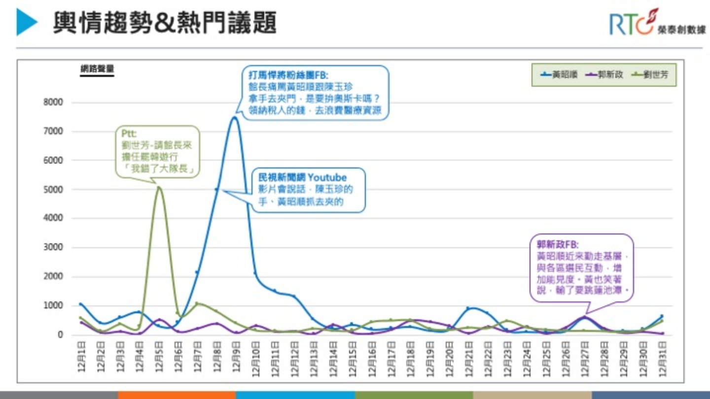 由《榮泰創數據》與《信傳媒》合作的聲量觀測來看,本選區在11月時,黃昭順與郭新政空軍實力幾乎匹敵,劉世芳被夾在黃昭順、郭新政之間,被搶走焦點。
