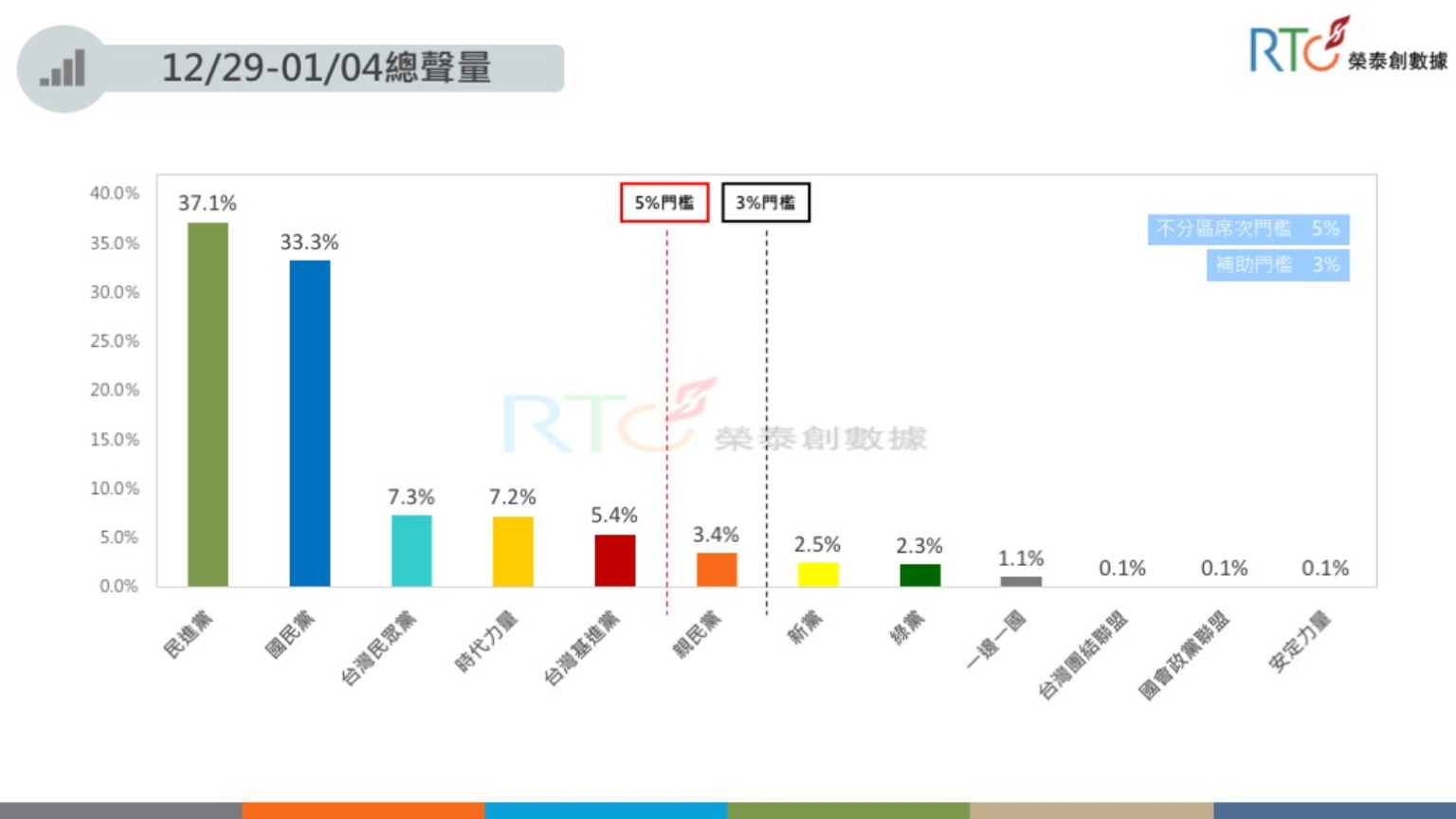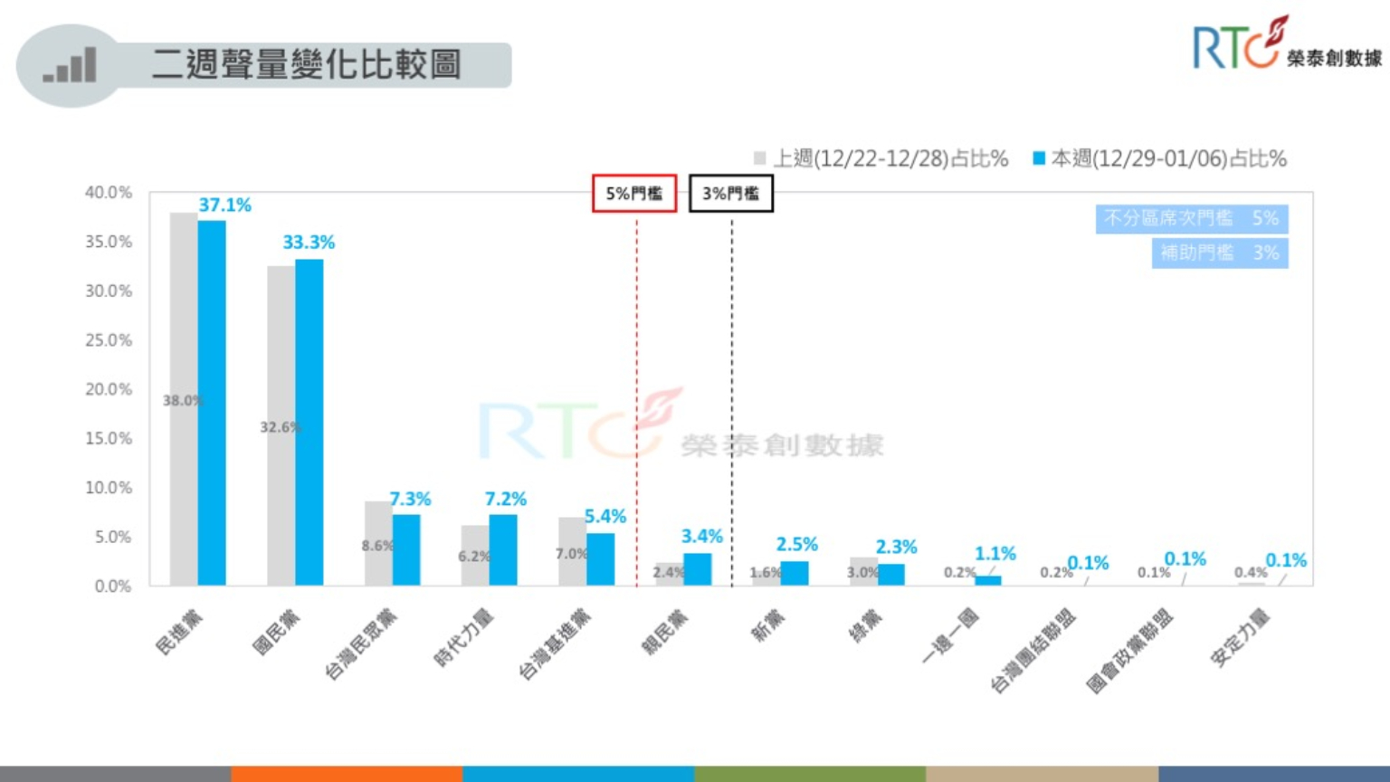 根據《信傳媒》與《榮泰創數據》的網路聲量分析,民進黨在12月29日到1月4日的聲量占比為37.1%,國民黨32.6%,台灣民眾黨7.3%,時代力量7.2%,台灣基進5.4%。時力在12月中遭基進擠出前四名後,借助《反滲透法》強勢回歸,聲量直追民眾黨。