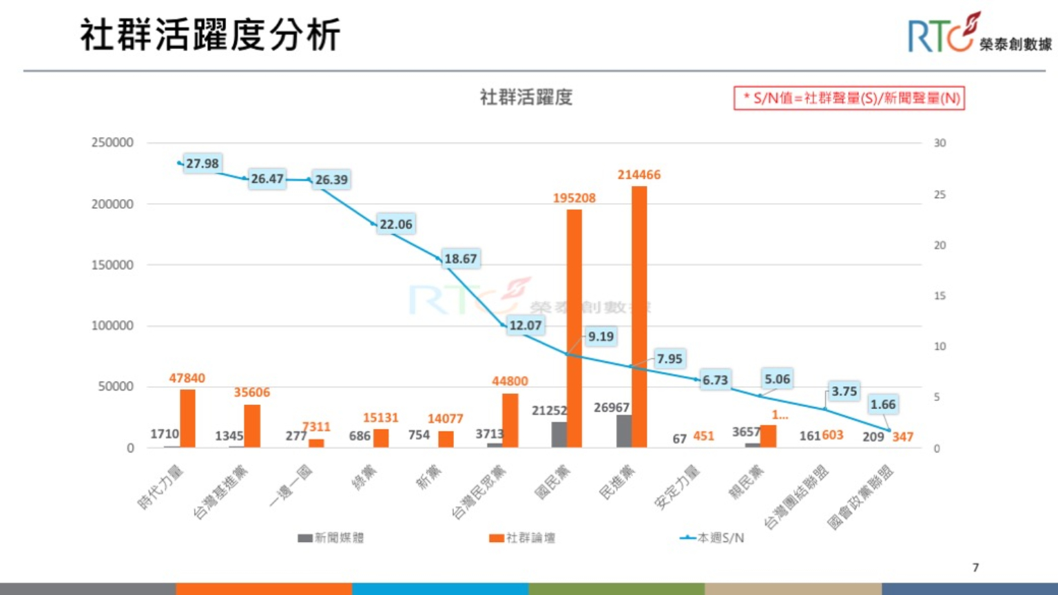 就聲量趨勢而言,民進黨聲勢持續霸佔第一,時力跟民眾黨雖然起伏大,但要達5%門檻應該也不是問題;親民黨跟新黨在選前一週有拚起聲量,維持熱度是能否突破門檻的關鍵;綠黨則在關鍵週跌出3%,想要拚政黨補助款,還要更加努力。