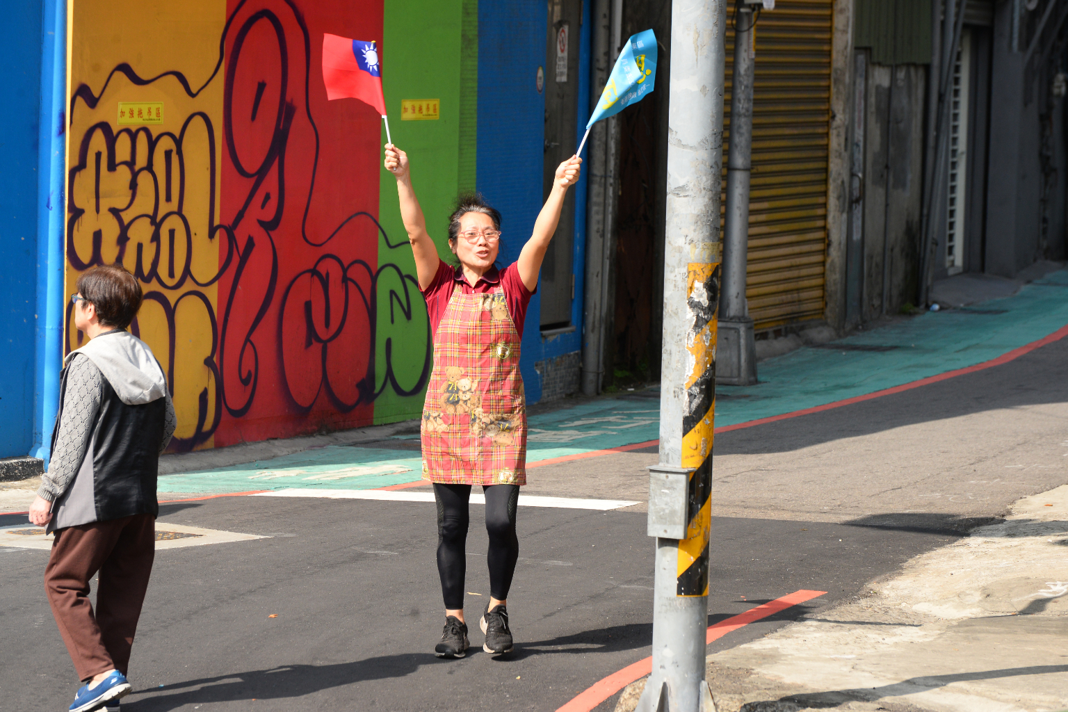 車隊行經板橋市區時,有民眾於巷口熱情揮舞著旗幟。(攝影/趙世勳)