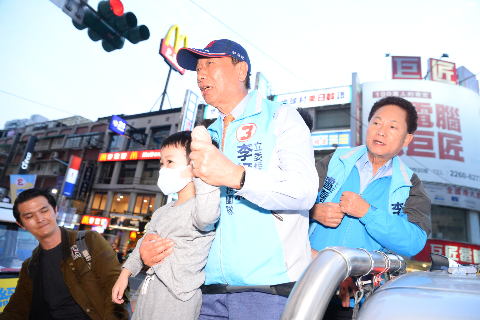 鴻海集團創辦人郭台銘今(7)日與新北市第十選區無黨籍立委候選人李縉穎開始掃街前,不少路過民眾就發現郭台銘的身影,趁等紅綠燈時間拿起手機拍照,還有小朋友大喊「郭董」,郭台銘也熱情與小朋友合影,拍完也重申「0到6歲兒童國家養」,跟路過的民眾打政見牌,爭取選民支持。
