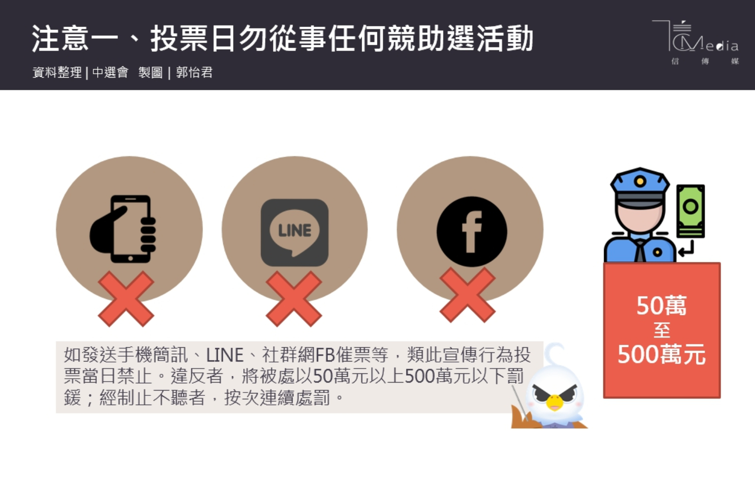 1、投票日勿從事任何競助選活動,如發送手機簡訊、LINE、社群網FB催票等,類此宣傳行為投票當日禁止。違反者,將被處以50萬元以上500萬元以下罰鍰;經制止不聽者,按次連續處罰。