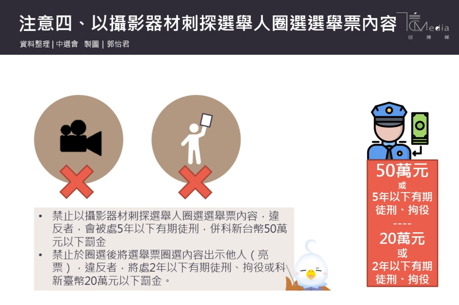 4、禁止以攝影器材刺探選舉人圈選選舉票內容,違反者,會被處5年以下有期徒刑,併科新台幣50萬元以下罰金;禁止於圈選後將選舉票圈選內容出示他人(亮票),違反者,將處2年以下有期徒刑、拘役或科新臺幣20萬元以下罰金。