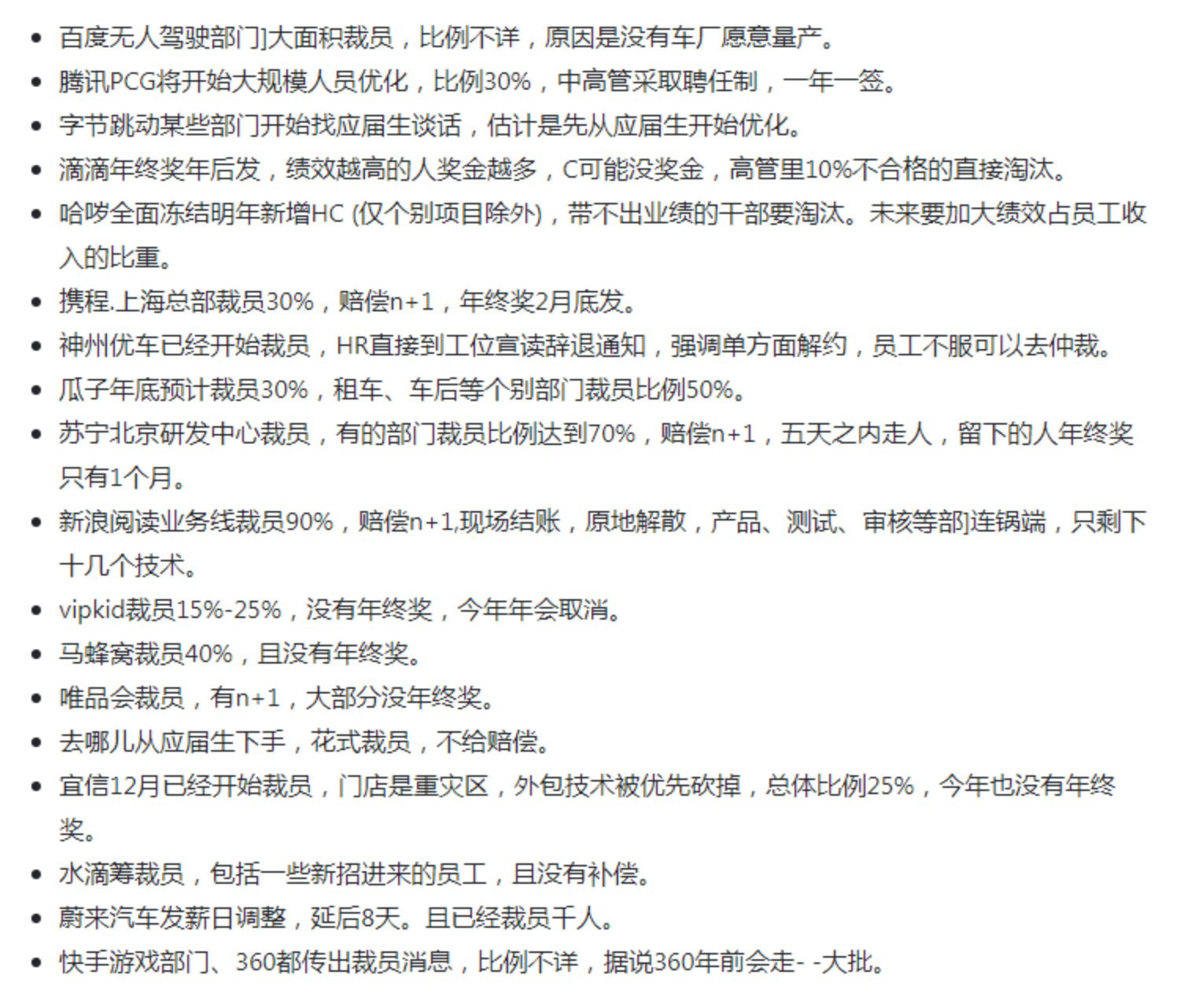 此外,網路近期瘋傳一篇《互聯網公司新一波裁員開始湧動,年關難過了》的報導說,百度無人駕駛部門大裁員,比例不詳,原因是沒有廠家願意量產:網路叫車服務公司滴滴出行的高級管理層將淘汰一成員工。
