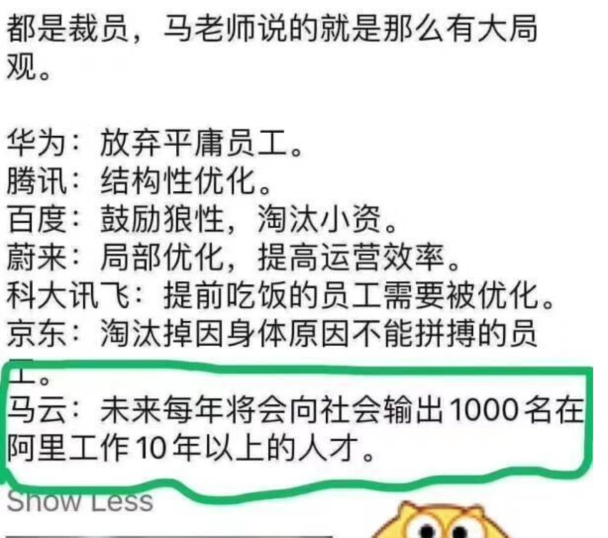 這段話1月5日下午在中國網路快速流傳,讓外界以為阿里也要裁員,1月7日,馬雲在重回課堂上回應「阿里裁員」傳言,他表示員工能在阿里熬到3年非常難,熬到10年都是寶貝。往社會送出去是因為經過阿里嚴格訓練後,他們對數字經濟、執行力等超越了很多其他公司,就應該去政府部門、大學等其他地方。