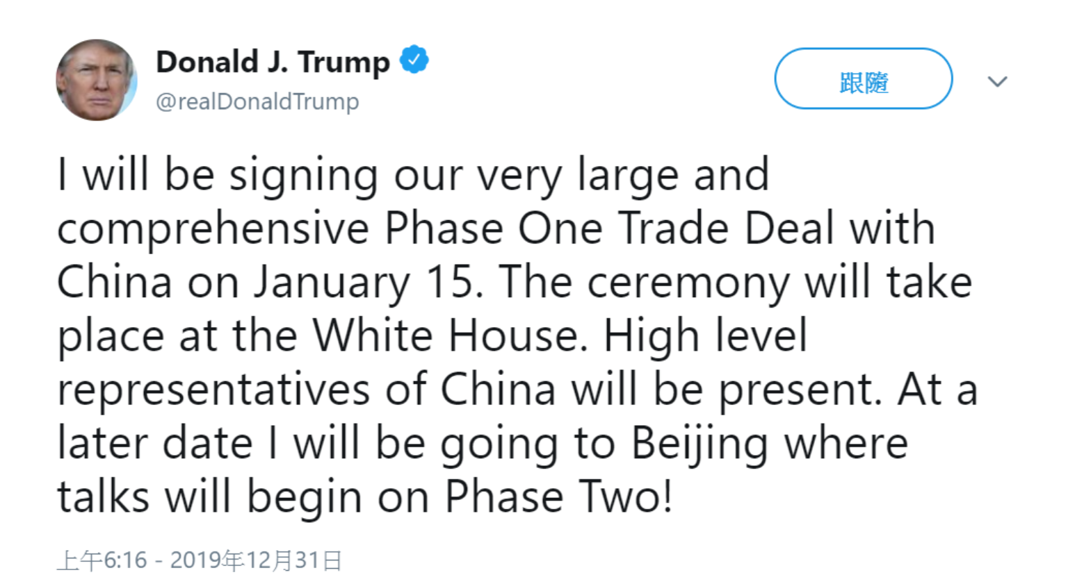 CNBC、福斯財經新聞網等外媒報導,1月9日美國總統川普(Donald Trump)表示,他會等到2020年11月美國總統大選結束後,再與中國簽第二階段貿易協議。