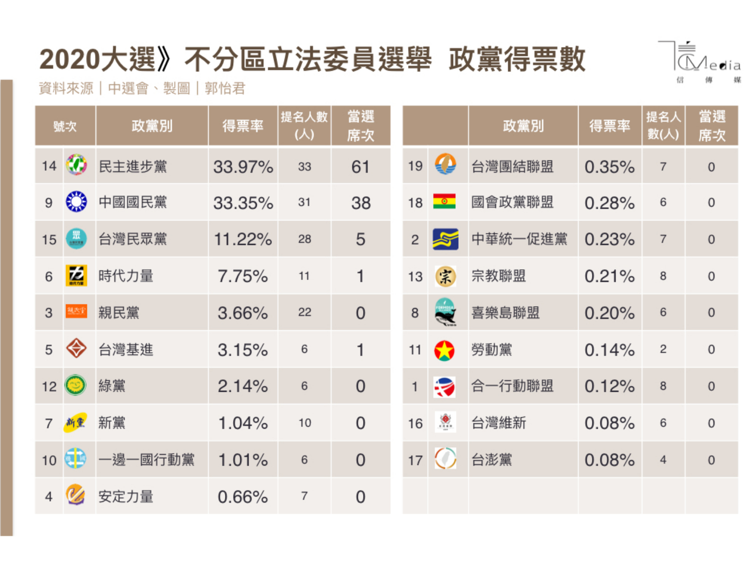 親民黨、台灣基進過3%門檻,雖然沒席次不過可獲得政黨補助款。