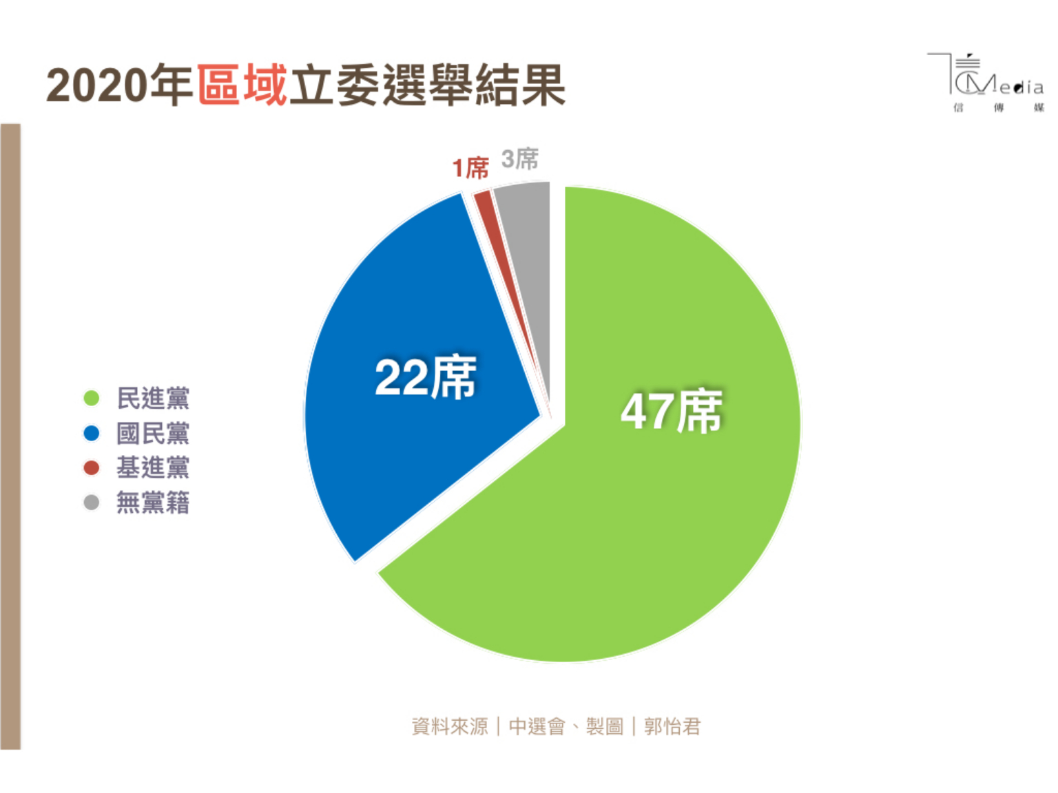 爭取連任的民進黨籍總統蔡英文以創紀錄的817萬票,大勝國民黨總統候選人韓國瑜(552萬票),超過260萬票,蔡英文總統大贏,也連帶帶動民進黨立委選情,這一次民進黨在驚險中取得單獨過半的62席,再度在中央與國會完全執政。