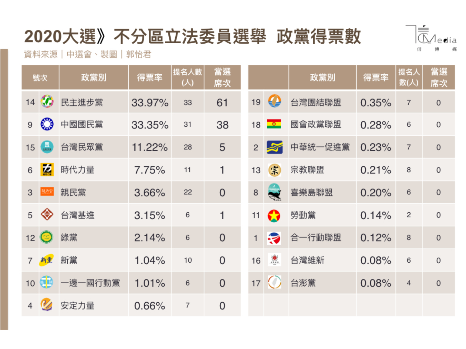 2020選舉結果出爐,總統蔡英文成功連任,民進黨國會席次也再度過半,總共拿下62席。