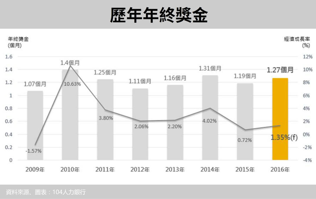 又到了歲末年終,再過一個月就到了農曆年發放年終獎金的時刻了,不少民眾開始關心年終到底能拿到多少。根據104資訊科技「2016年終獎金調查報告」顯示,受惠今年景氣稍微好轉,2016年企業平均年終為1.27個月,比起2015年增加2.4天。