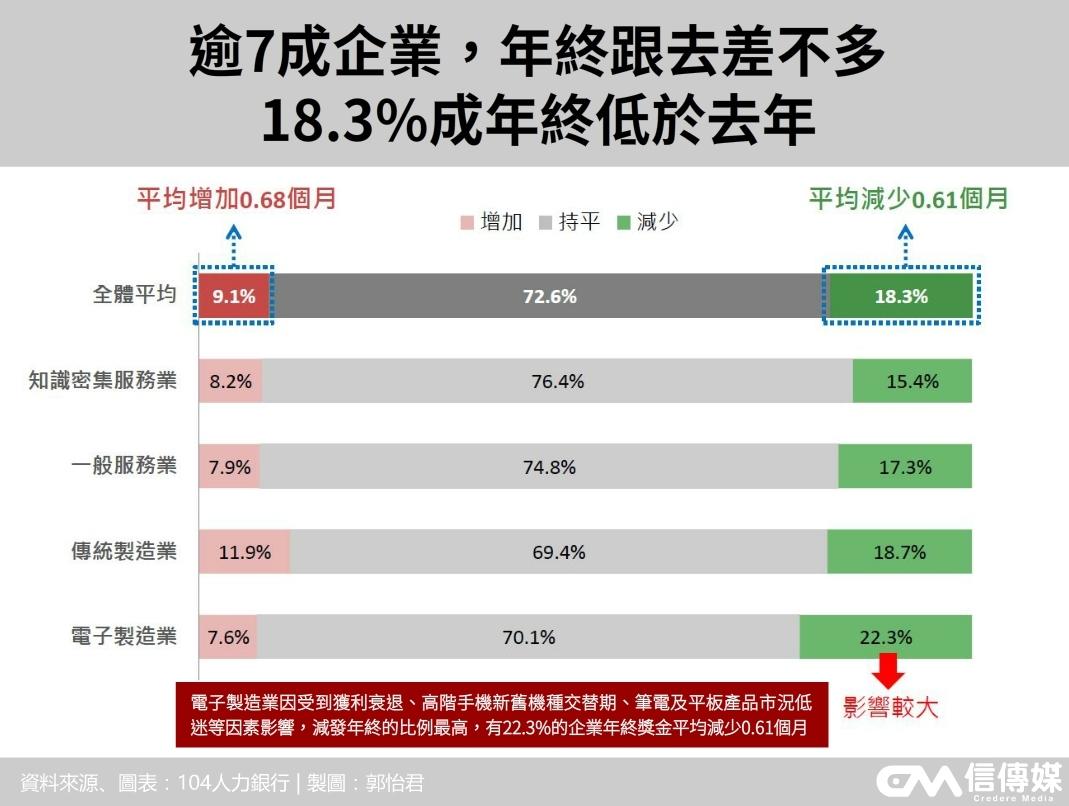 根據調查顯示,事實上有72.6%的企業,今年的年終和去年差不多,甚至還有18.3%的企業是低於去年水準。其中,電子製造業因受到獲利衰退、高階手機新舊機種交替期、筆電及平板產品市況低迷等因素影響,減發年終的比例最高,有22.3%的企業年終獎金平均減少0.61個月。