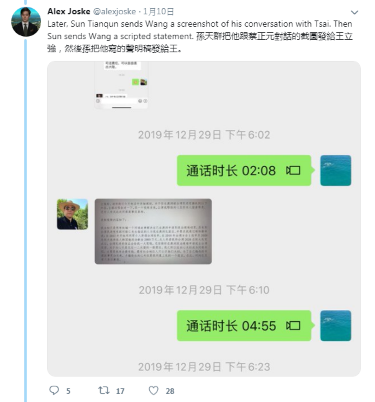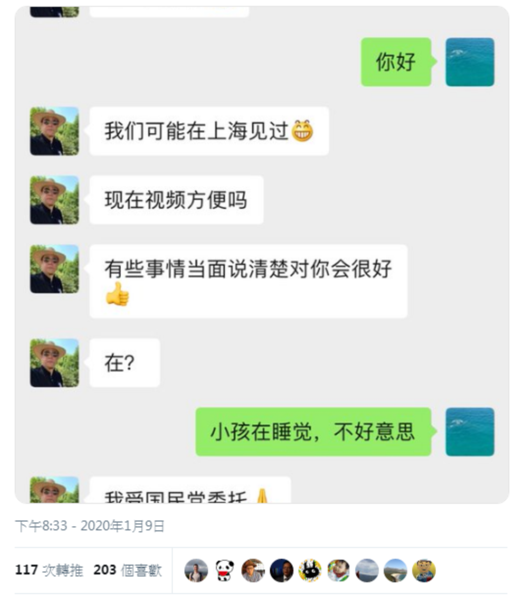 周安瀾在推特上貼出第一張 截圖顯示孫天群與王立強的對話,某一天孫天群用微信傳訊息給王立強,孫某稱「兩人可能在上海見過面」,要求視訊,並說「有些事情當面說清楚,對你會很好」。王立強以小孩在睡覺為由婉拒,但孫某接著挑明;「我受國民黨委託」…。