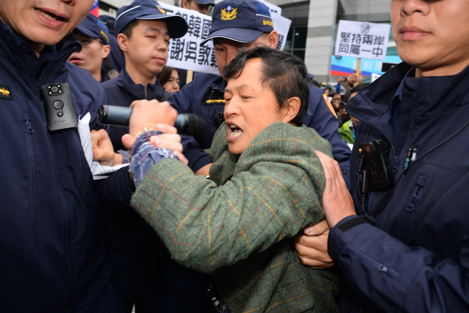 台灣國辦公室主任陳峻涵於黨部前遭警察驅離。(攝影/趙世勳)