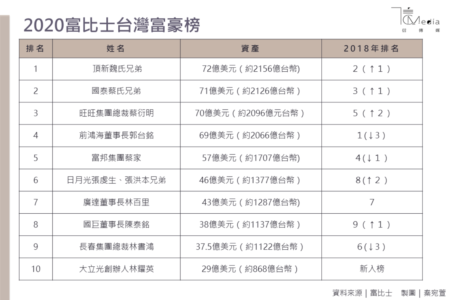 美國《富比士》(Forbes)公布2020台灣前50大富豪排行榜,2018年的台灣首富鴻海創辦人郭台銘,這次竟跌出前三名,以身家69億美元(約新台幣2066億)排名第四,而台灣首富則換成頂新魏家,雖然官司纏身仍以72億美元約(約新台幣2156億)躍升首富。