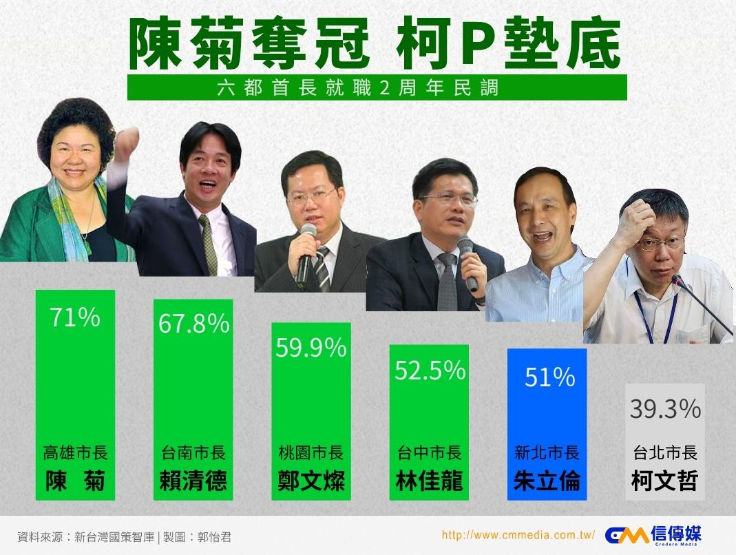 新台灣國策智庫20日公布六都首長就職2周年民調,高雄市長陳菊以71%稱冠,台南市長賴清德67.8%居第二,第三是桃園市長鄭文燦59.9%,第四是台中市長林佳龍52.5%,第五是新北市長朱立倫51%,第六是台北市長柯文哲39.3%。
