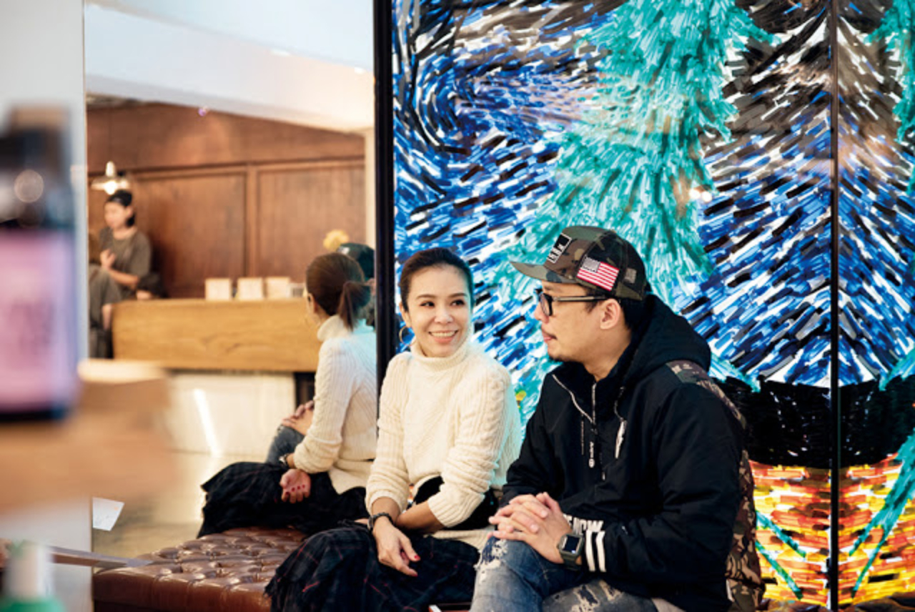 在Yoko眼裡,David吸引她的是這份無拘無束的才氣,「我很欣賞他是一個創作力很強的人,因為這是我沒有的,而且面對壓力他也很少處於緊繃的狀態,這也是我所羨慕的。」在兩人身後的大片玻璃上映著濃烈梵谷風格的裝置藝術,其實就出自David之手,每年耶誕節都是他的藝術展,連美髮用的工作手套都能變成他的創作素材,組合成造型耶誕樹,被其他同事笑稱是「被美髮耽誤的藝術家」。