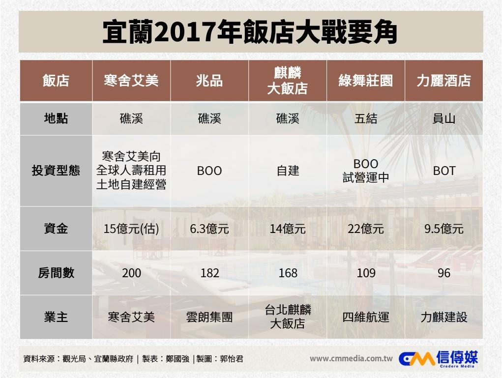 大財團百億元的宜蘭投資,都將在2017年開花結果。據調查,包括寒舍艾美、雲朗集團、四維航運、力麒建設,過去幾年來投資興建的觀光飯店,將在2017年陸續開業,福華飯店則可能租下現有飯店營業,合計將為宜蘭的飯店住宅市場新增1300個房間。