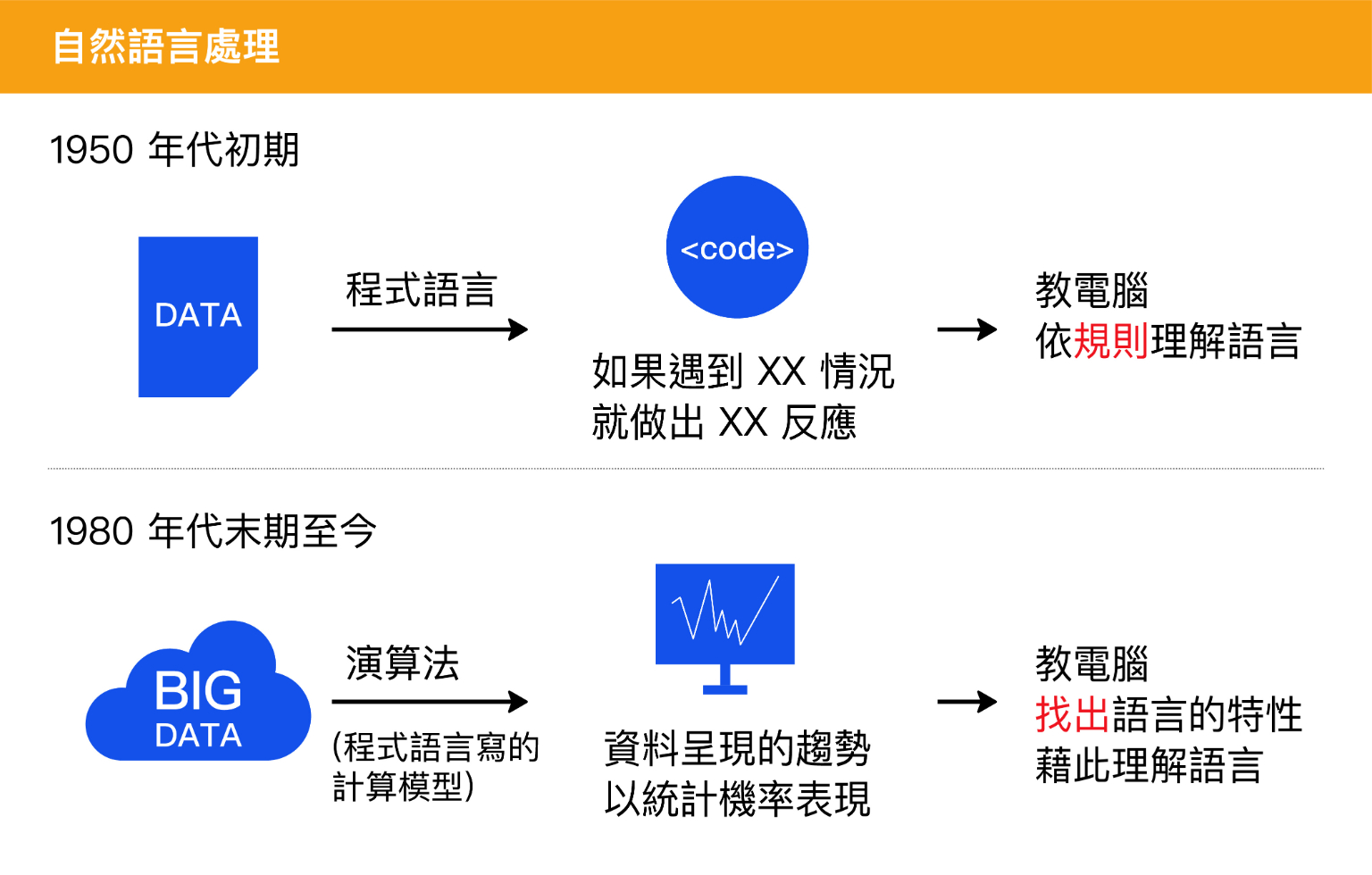 自然語言處理透過這兩個步驟,將複雜的語言轉化為電腦容易處理、計算的形式。早期是人工訂定規則,現在則是讓機器自己學習。