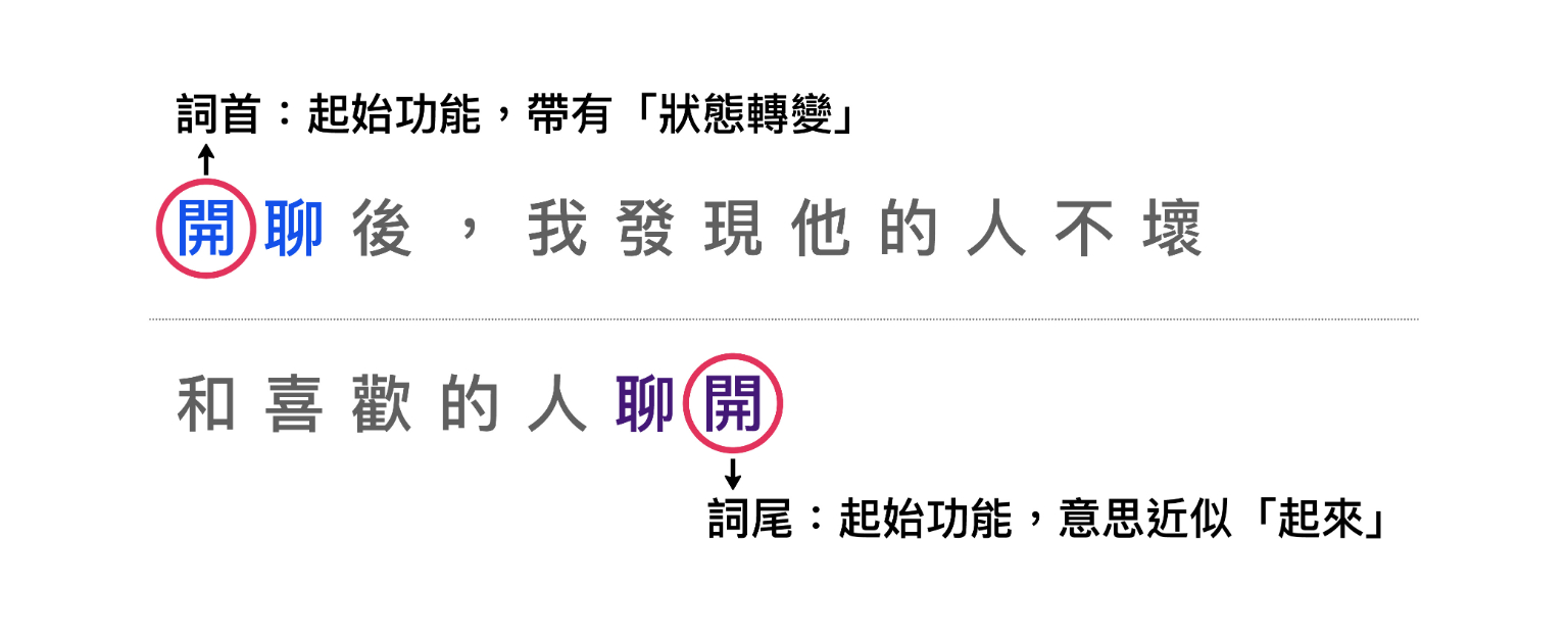 從語言學的角度,動詞是句子的核心,也是最重要的中心語。「開」這個字有著動詞中心語的起始功能 (inchoative),然而放在詞首、詞尾不同位置會產生些微差異。