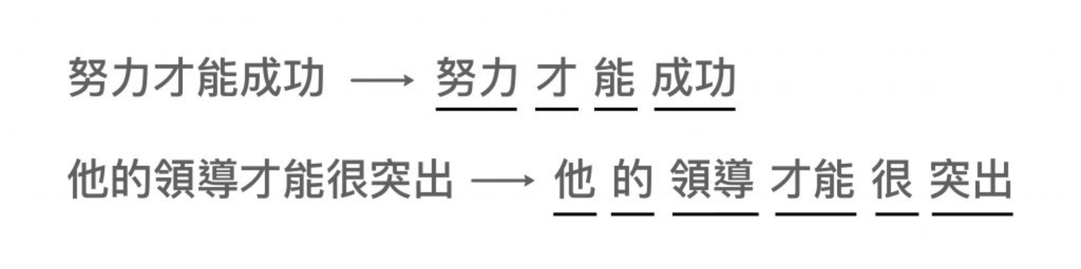 此外,就算是字典當中已經有的詞彙,有時候仍然會有不同斷詞的情況,我們必須根據上下文決定哪一種斷法才是正確的。例如:「努力才能成功」的「才能」應該切分為兩個詞彙:「才」和「能」,語義接近英文的 “to make";而「他的領導才能很突出」的「才能」是一個詞彙,不可切分,在此表達英文的 “ability" 的意思。